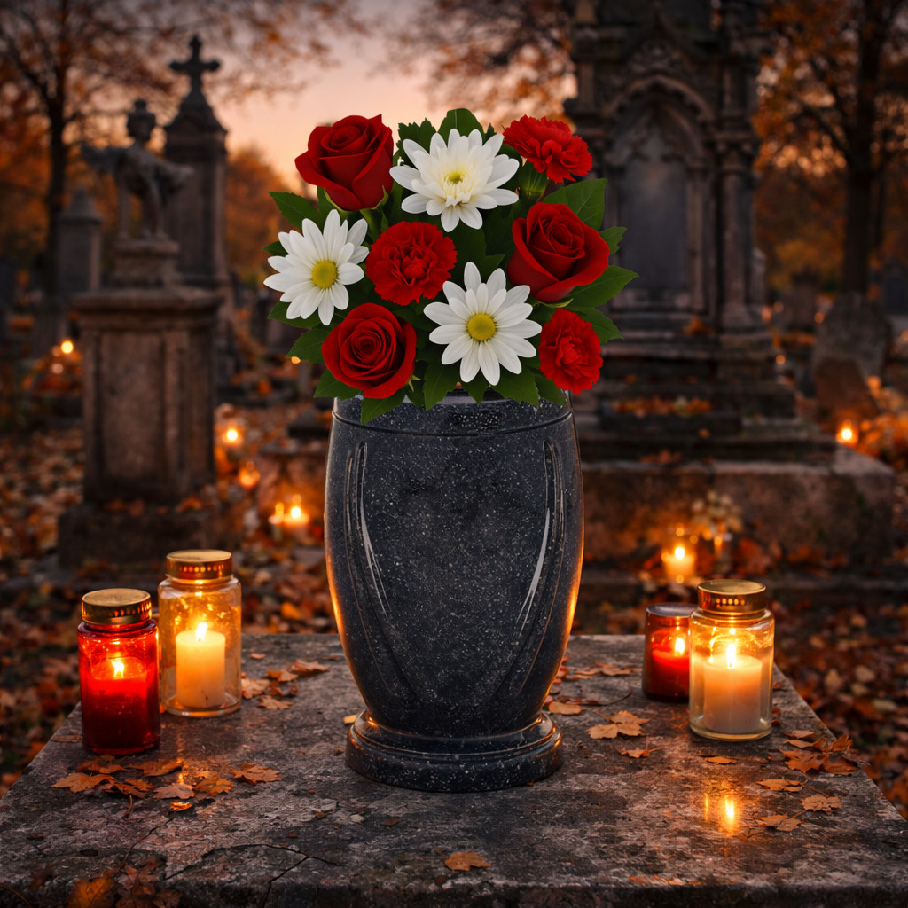 Im Lieferumfang enthalten sind die Vase und optional eine Gedenktafel mit Ihrem Wunschtext. Die abgebildeten Blumen sind nicht Teil des Sets.