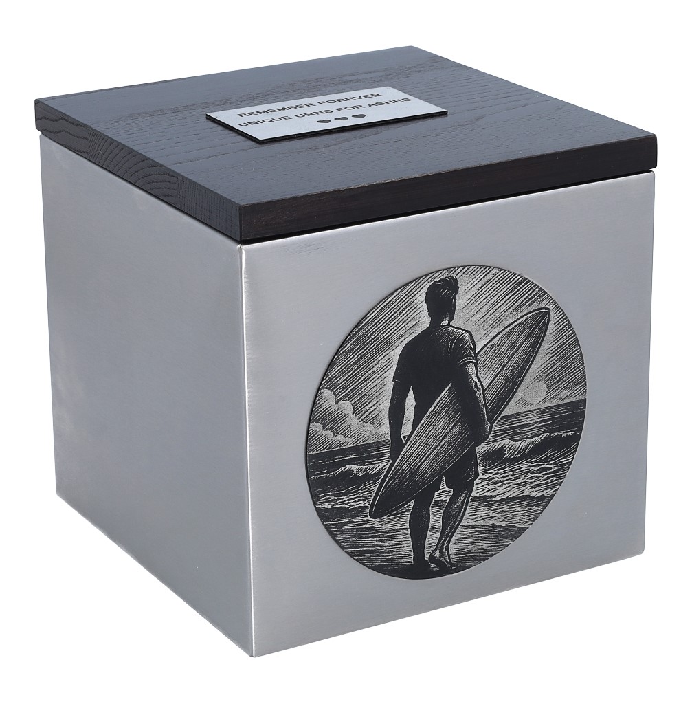 Eine elegante Urne für Surfbegeisterte. Der Korpus aus hochwertigem, gebürstetem Edelstahl und der Deckel aus dunklem Holz bilden eine zeitlose Materialkombination. Die Vorderseite ziert eine kunstvoll gravierte Grafik eines Surfers mit Surfbrett am Strand – ein Symbol für Mut, Freiheit und die Liebe zu den Wellen.