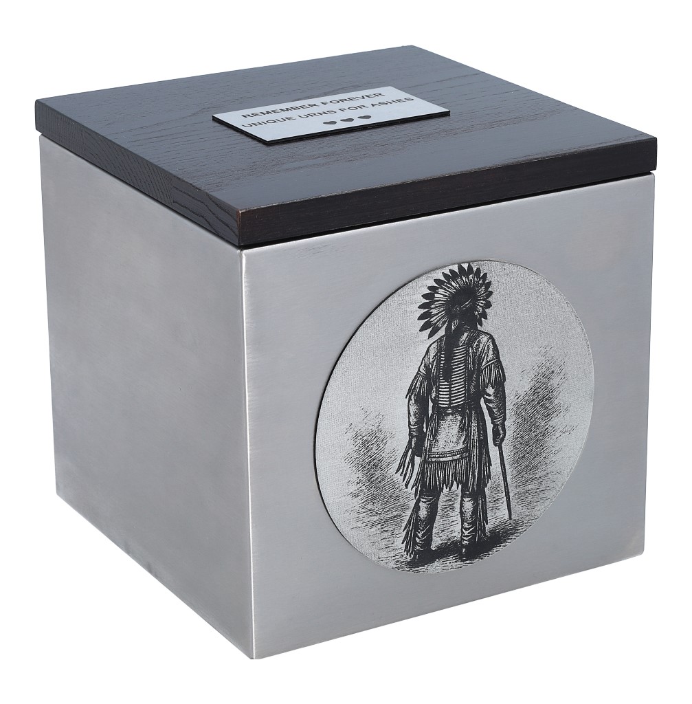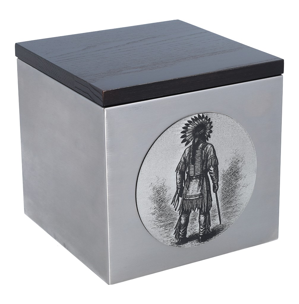 Sie ist aus hochwertigem, gebürstetem Edelstahl gefertigt und mit einem eleganten, dunklen Holzdeckel versehen. Die Vorderseite ziert ein fein graviertes Motiv eines Häuptlings in traditioneller Tracht mit Federbusch und Stab – eine Figur, die dem Horizont entgegenblickt und den Übergang in eine andere Welt symbolisiert.