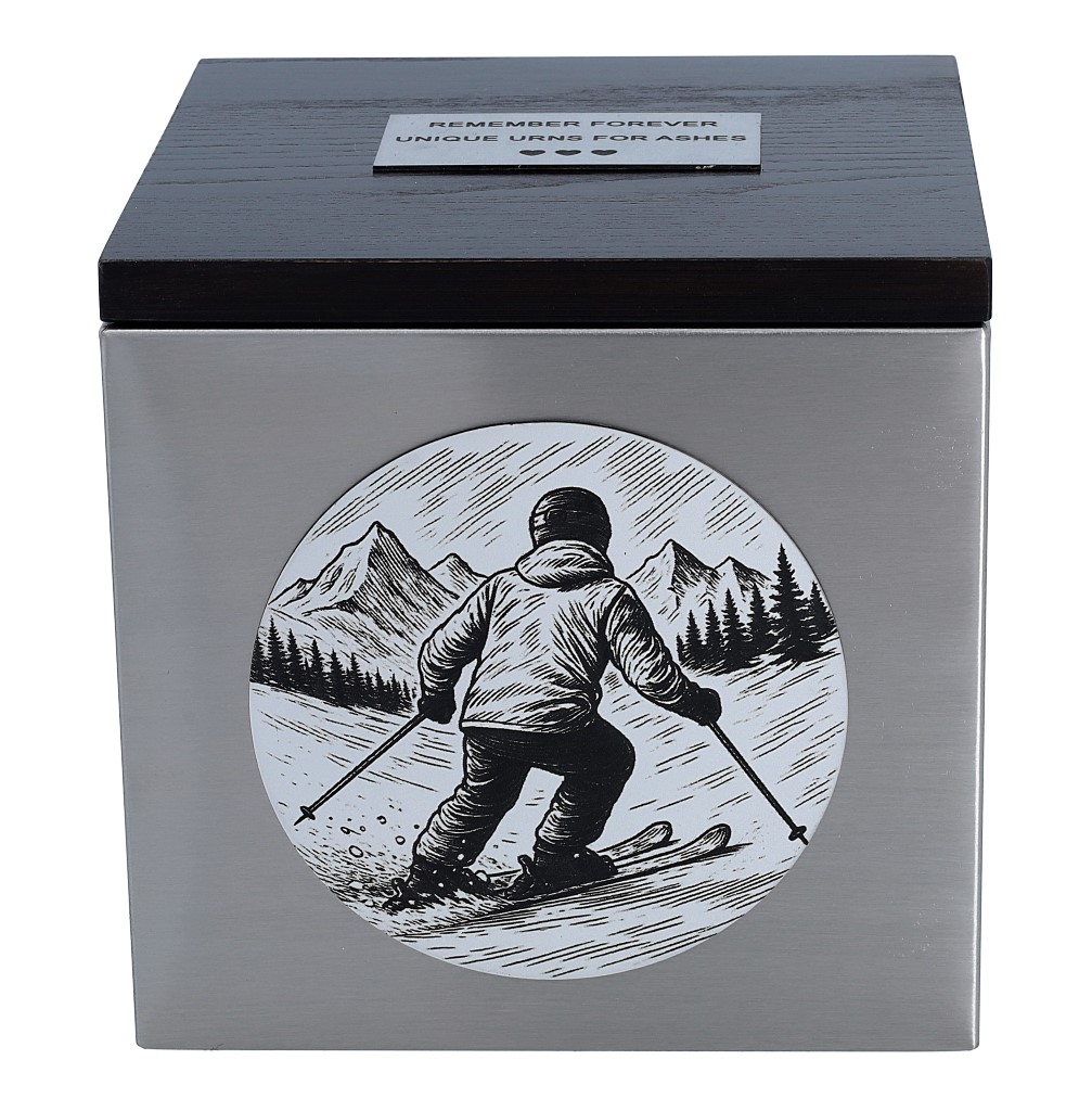 Esta urna única fue diseñada para quienes amaban la montaña, la nieve y la libertad de esquiar. Fabricada en acero inoxidable de alta calidad con una elegante tapa de madera, combina un minimalismo moderno con un profundo mensaje emotivo.