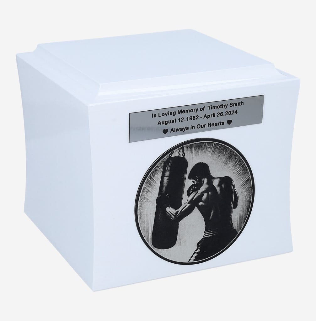 L’urne a la forme d’une élégante boîte aux bords légèrement arrondis. Elle est disponible en deux couleurs classiques – noir ou blanc – pour s’harmoniser avec les goûts et le caractère du défunt. Sur le devant, un motif gravé représente un boxeur à l’entraînement, symbole de force, de concentration et de passion. Au-dessus du motif se trouve une plaque personnalisée sur laquelle vous pouvez inscrire un nom, des dates ou un message personnel.