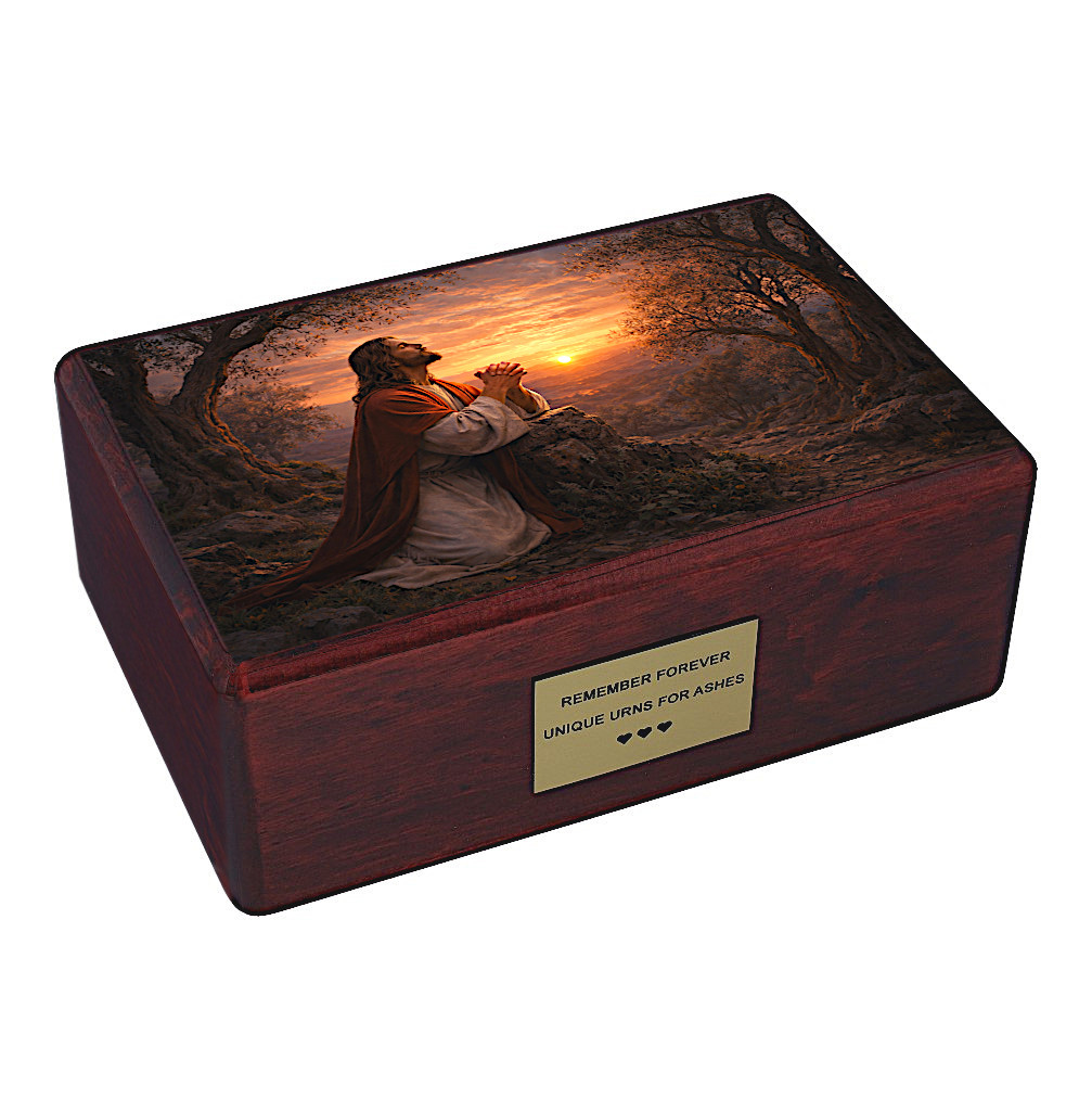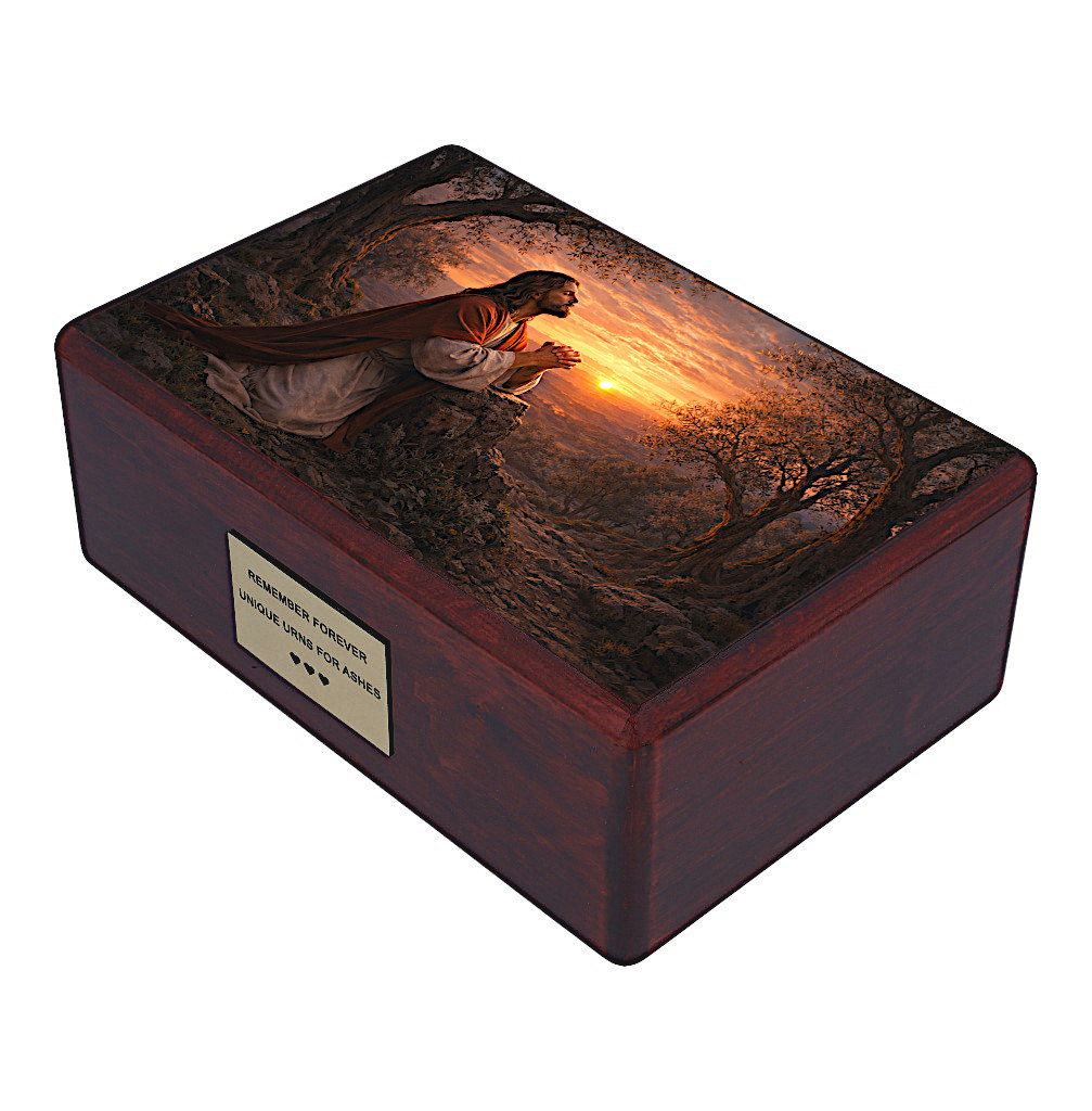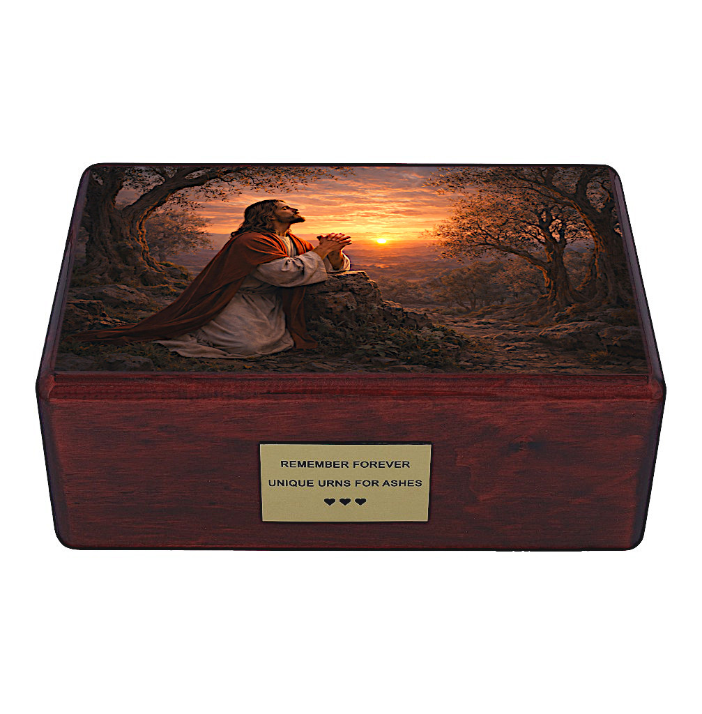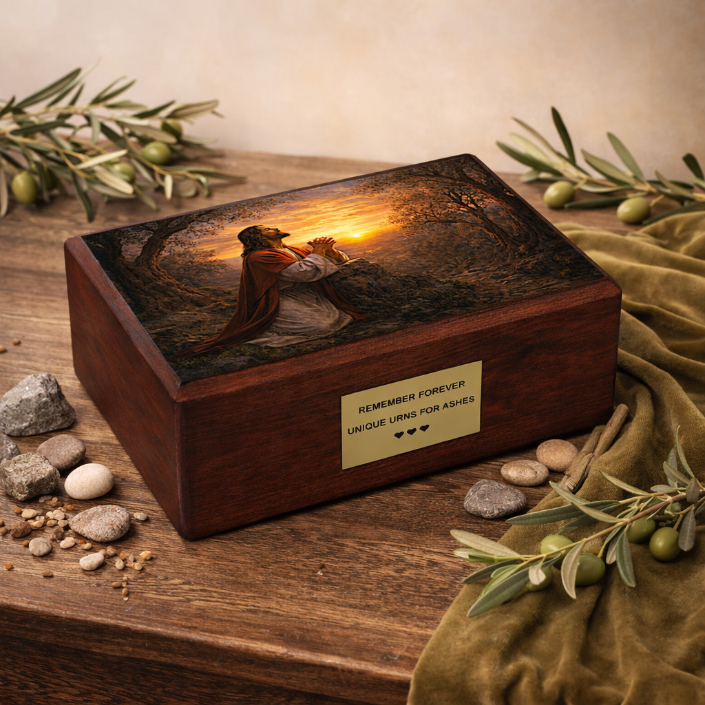 Onora la memoria della persona amata con questa urna cineraria cattolica finemente realizzata, che raffigura un’immagine profondamente toccante di Gesù che prega nel Giardino del Getsemani. Questa potente scena biblica simboleggia fede, sacrificio, speranza e pace eterna — offrendo conforto nei momenti di ricordo.