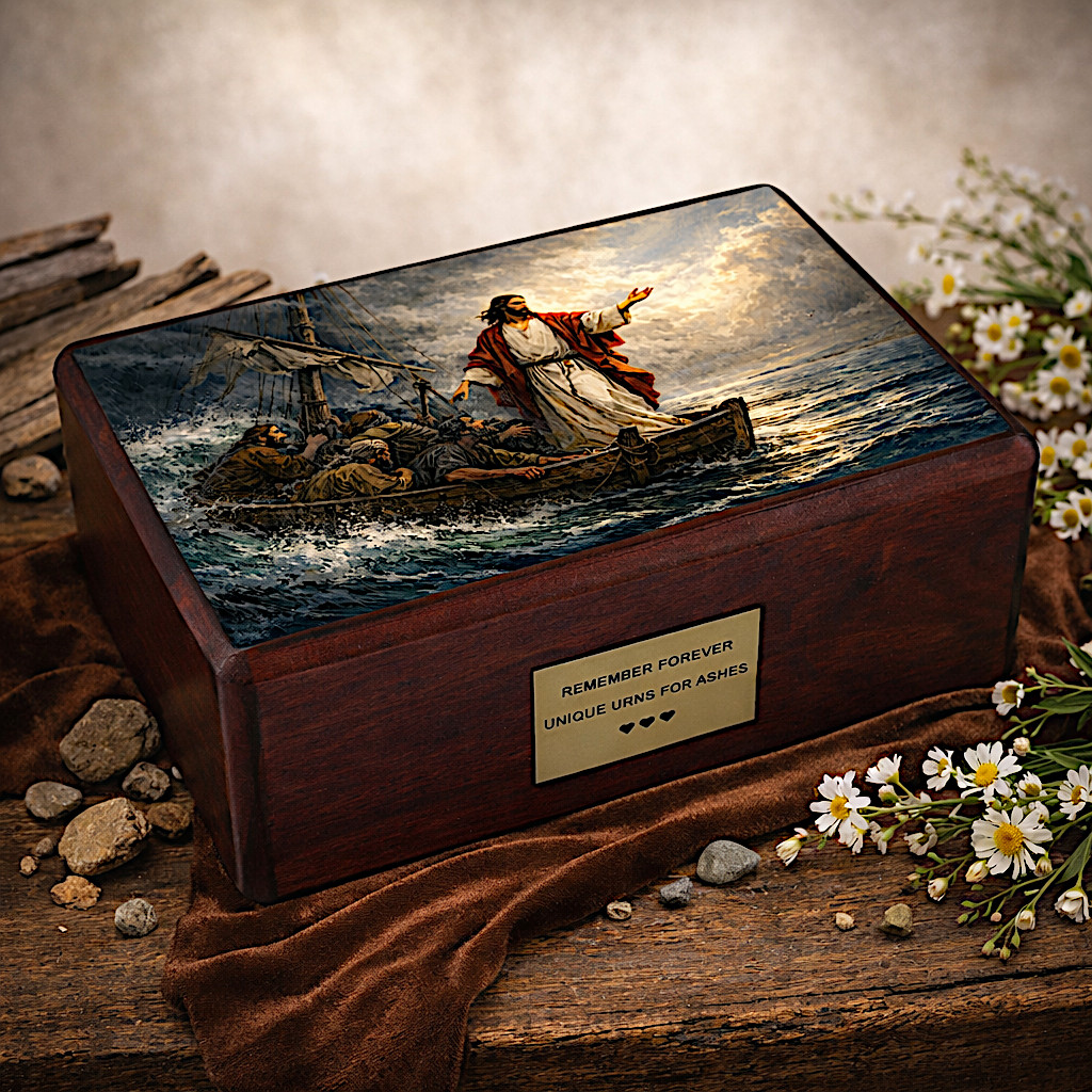 Commemora il tuo caro con questa urna cineraria cattolica significativa e finemente lavorata, che raffigura la potente scena biblica di Gesù che placa la tempesta e le onde. Questa immagine rappresenta la fede, la speranza e la pace divina — ricordandoci che, anche nelle tempeste più grandi della vita, non siamo mai soli.