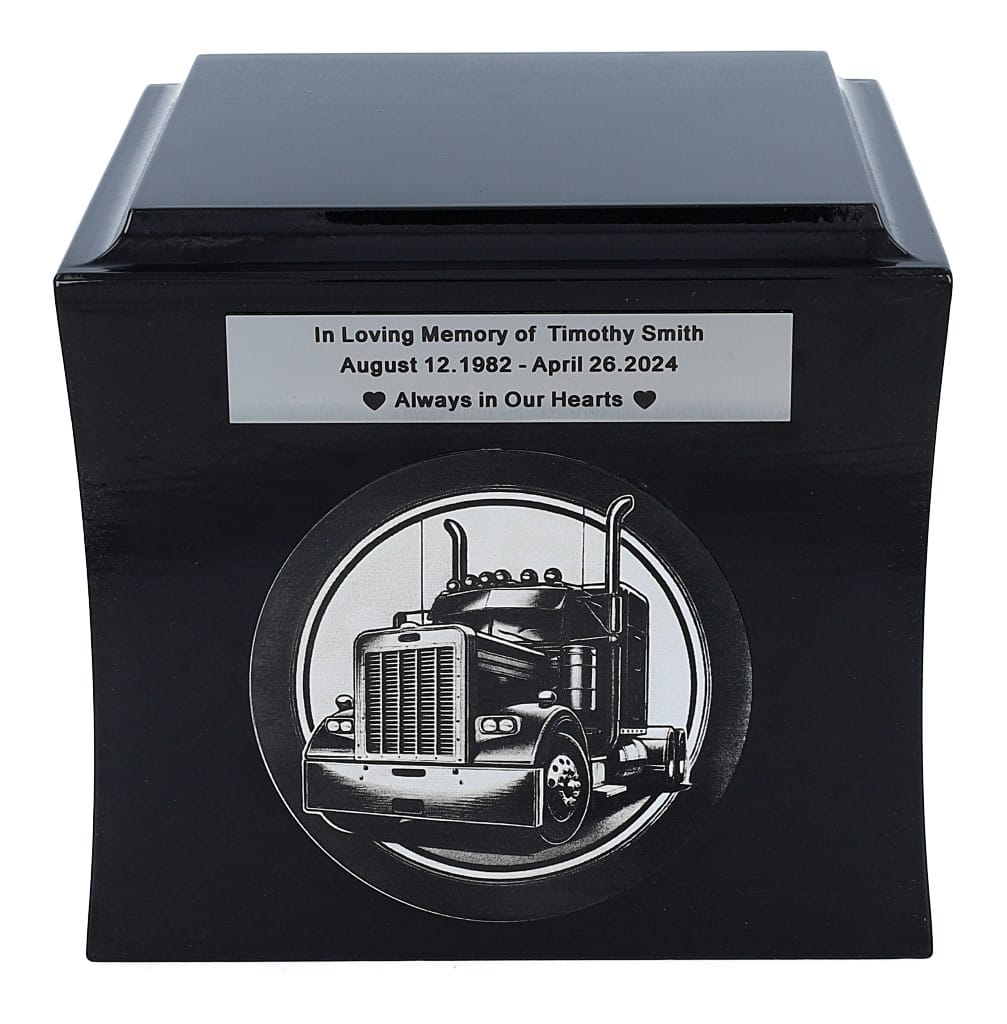 L’urna ha una classica forma a scatola, disponibile in nero o bianco, con bordi delicatamente arrotondati. Sul fronte è incisa l’immagine di un camion, a simboleggiare l’amore per la strada e la professione di autista. Appena sopra l’immagine è presente una targa personalizzata su cui è possibile incidere un nome, delle date o una dedica personale, rendendo l’urna ancora più speciale e personale.