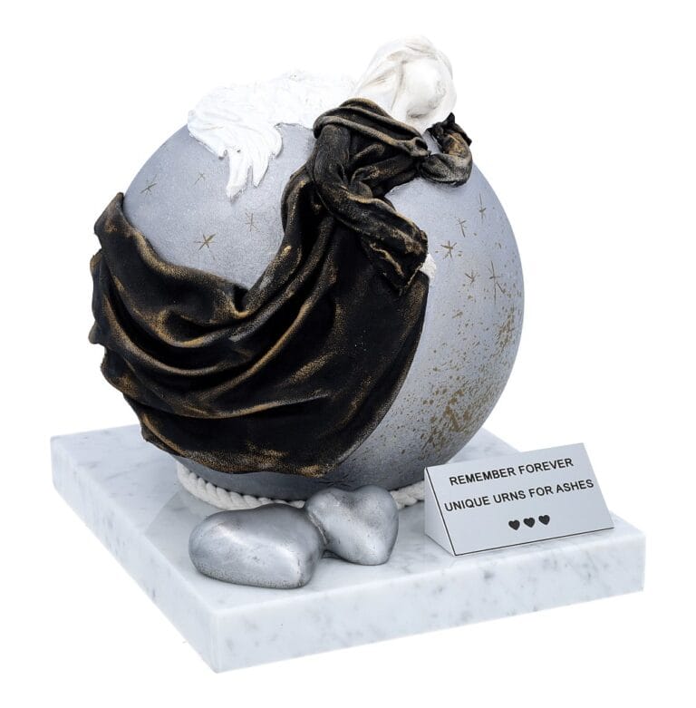 Uczcij pamięć ukochanej osoby dzięki Artystycznej Urnie z Aniołem, pięknie wykonanemu hołdowi, który łączy w sobie elegancję, symbolikę i artystyczne rzemiosło. Ta wyjątkowa urna kremacyjna zawiera ręcznie malowaną kulę ze stali nierdzewnej, wdzięcznie osadzoną na solidnej marmurowej podstawie, tworząc ponadczasowy i znaczący pomnik. Na szczycie kuli spoczywa ręcznie wykonany anioł, symbolizujący ochronę, pokój i wieczne przewodnictwo.