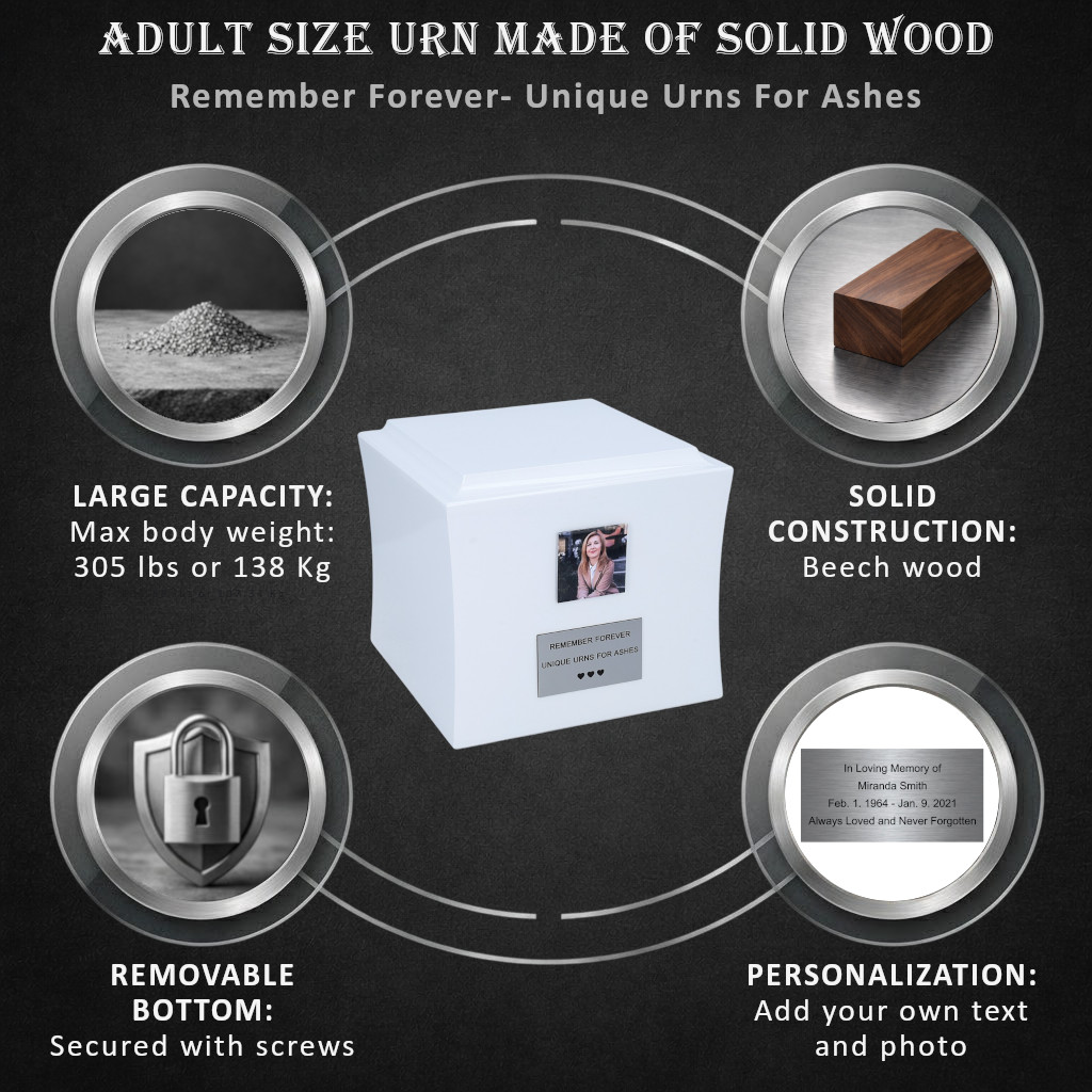 Ta elegancka, biała, drewniana urna kremacyjna została zaprojektowana, aby z wdziękiem i prostotą uczcić pamięć ukochanej kobiety. Wykonana z wysokiej jakości drewna i wykończona w delikatnej, białej tonacji, urna charakteryzuje się delikatnie zaokrąglonymi krawędziami, które tworzą spokojny i harmonijny wygląd.