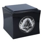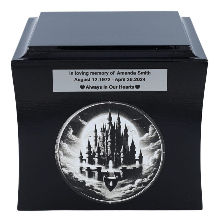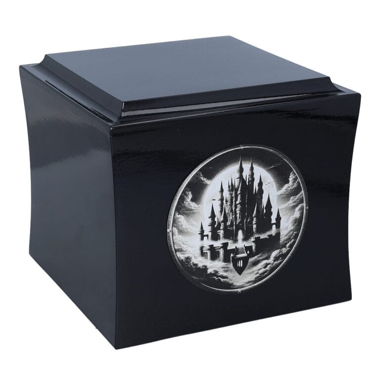 Urna ma klasyczny kształt pudełka i jest dostępna w czarnym lub białym kolorze. Jej delikatnie zaokrąglone krawędzie nadają elegancki i nowoczesny wygląd. Na froncie znajduje się grawerowana grafika zamku unoszącego się w chmurach – motyw ten symbolizuje spokój, marzenia i przejście do innego, lepszego świata.