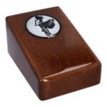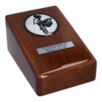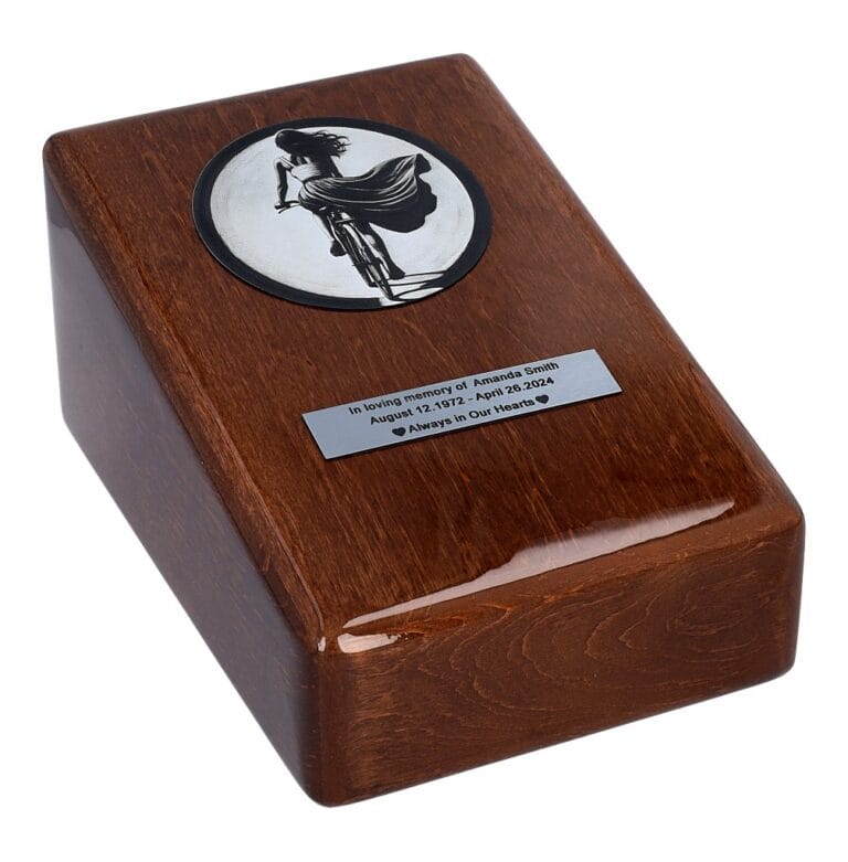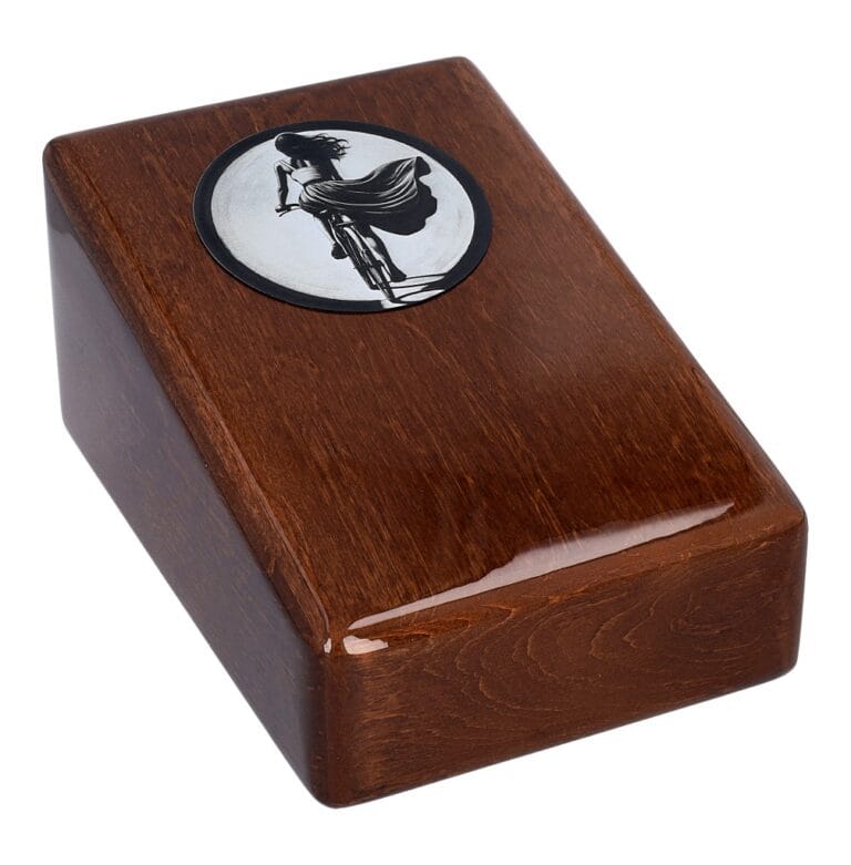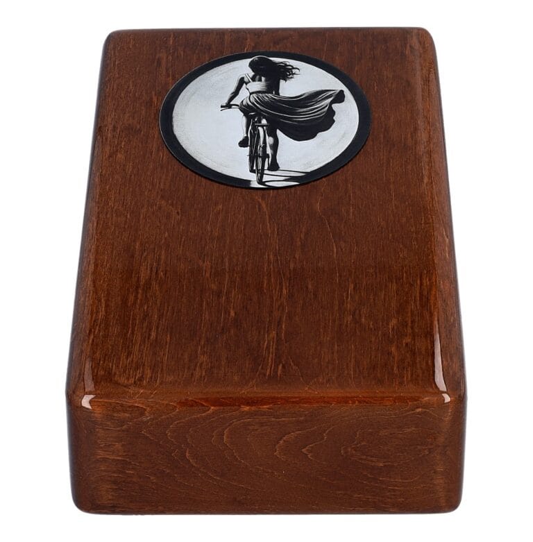 To drewniana urna w kształcie pudełka, dostępna w eleganckim czarnym lub białym kolorze, z delikatnie zaokrąglonymi krawędziami. Na jej froncie znajduje się grawerowana grafika kobiety jadącej na rowerze, odzwierciedlająca ducha przygody, radość i lekkość, jaką rower dawał jej na co dzień.