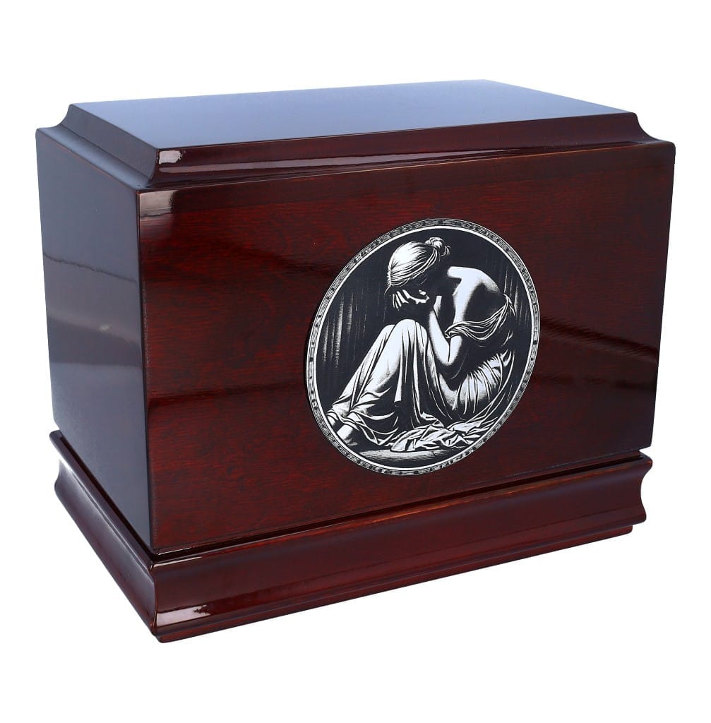 Drewniana urna pogrzebowa z wizerunkiem płaczącej kobiety, nostalgia