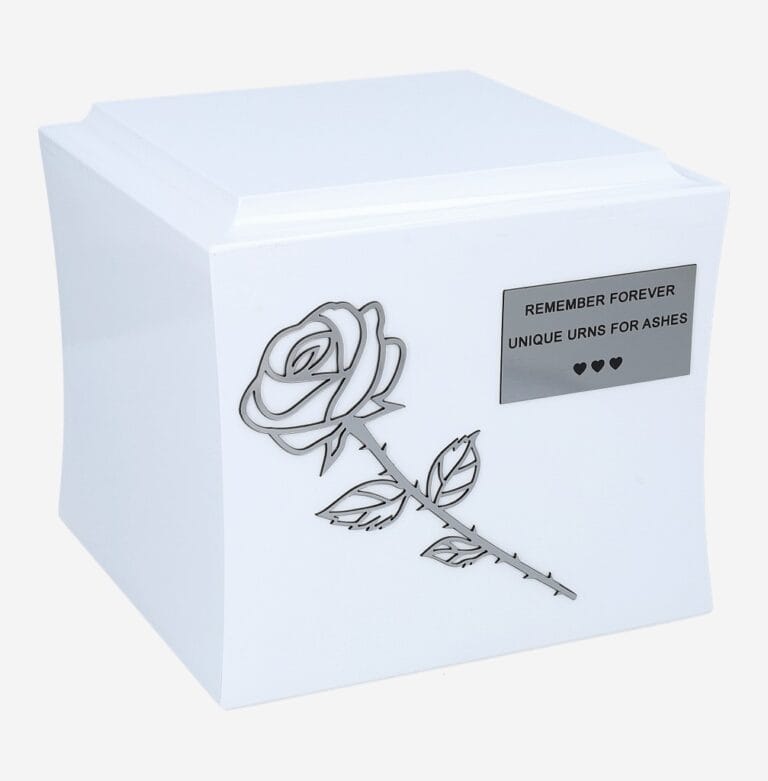 Uczcij pamięć bliskiej osoby dzięki drewnianej urnie z różą, symbolizującej miłość, wspomnienia i piękno, które trwa wiecznie. Wykonana z wysokiej jakości litego drewna, urna w kształcie skrzynki z delikatnie zaokrąglonymi krawędziami stanowi eleganckie i ponadczasowe miejsce spoczynku. Na froncie umieszczona została subtelna srebrna róża, będąca symbolem wiecznej miłości, oraz spersonalizowana tabliczka pamiątkowa, na której można wygrawerować imię, daty lub osobiste przesłanie, tworząc unikalną pamiątkę.