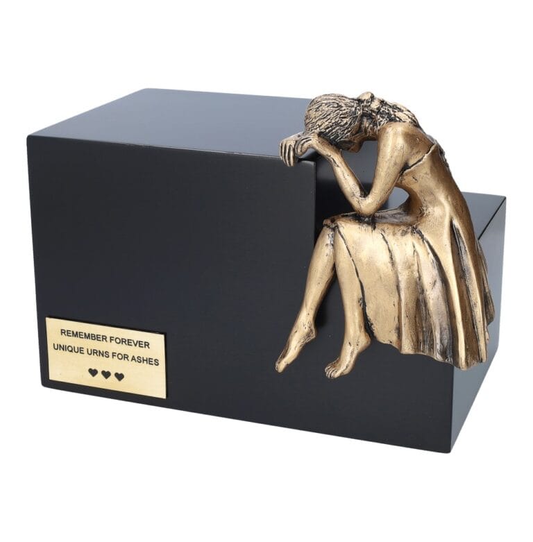 Artystyczna figura kobiety symbolizuje smutek i nostalgiczne wspomnienia, które towarzyszą nam po stracie bliskiej osoby. Złoty kolor dodaje urnie jeszcze bardziej eleganckiego charakteru, co pozwala na zachowanie pamięci o zmarłym w piękny i szlachetny sposób. Istnieje również możliwość dołączenia grawerowanej plakietki z własnym tekstem, co umożliwia personalizację czyli dodanie na plakietce imienia, nazwiska, dat oraz kilku osobistych słów.