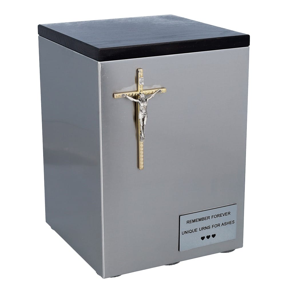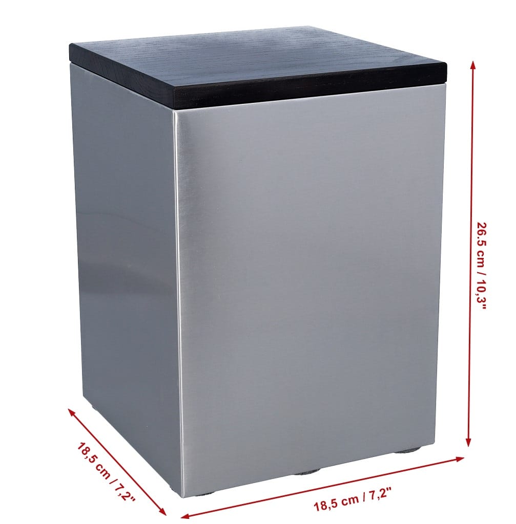 Wykonany w całości ze stali nierdzewnej, pojemnik jest trwały, odporny na uszkodzenia i ma elegancki, nowoczesny wygląd. Wewnętrzne wymiary (wysokość 23.5cm / 9.5″, szerokość 16.5 cm / 6,4″, długość 16.5 cm / 6,4″) są dopasowane do urny tymczasowej o maksymalnych wymiarach: wysokość 23 cm / 9″ szerokość 16 cm / 6.3″, dzięki czemu kapsuła idealnie mieści się w środku.