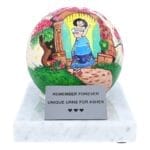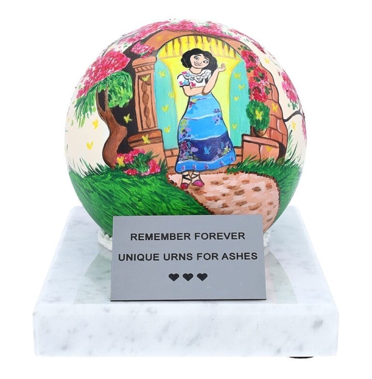 Ta wyjątkowa urna zawiera kulę ze stali nierdzewnej ręcznie malowaną z pogodną sceną ogrodową, przedstawiającą młodą dziewczynę bawiącą się wśród żywej gamy kwiatów.