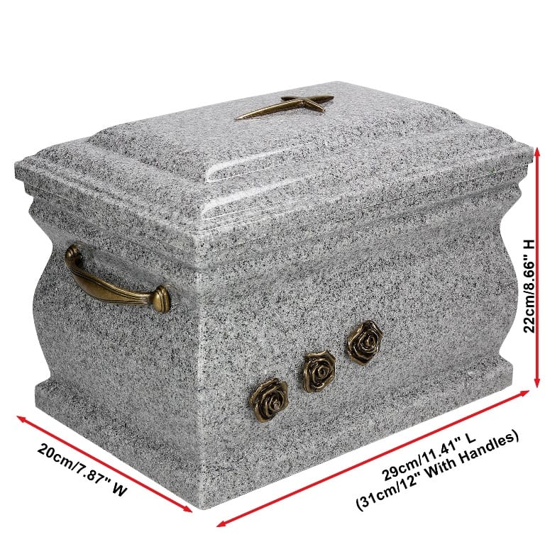 Prezentujemy Państwu klasyczną szarą urnę pogrzebową wykonaną z granitu, która na pewno spełni Państwa oczekiwania co do trwałości i estetyki. Urna jest dostępna z krzyżykiem oraz grawerowaną plakietką, co pozwala na spersonalizowanie jej według własnych upodobań. Dzięki otwieranej górnej pokrywie umieszczenie prochów jest bardzo łatwe i nie wymaga specjalnych umiejętności.