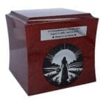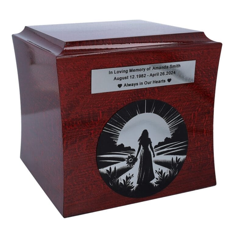 Urna z grawerowanym tekstem oraz grafiką przedstawiającą odchodzącą kobietę w stronę światła symbolizuje wieczną podróż i przejście do innego wymiaru. Ten wzruszający obraz ma na celu przynieść ukojenie i poczucie spokoju, przypominając, że mimo fizycznej straty, duchowa obecność bliskiej osoby pozostaje z nami na zawsze. Grawerowany tekst dodaje osobistego charakteru, uwieczniając pamięć o zmarłej w sposób pełen szacunku i miłości.