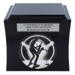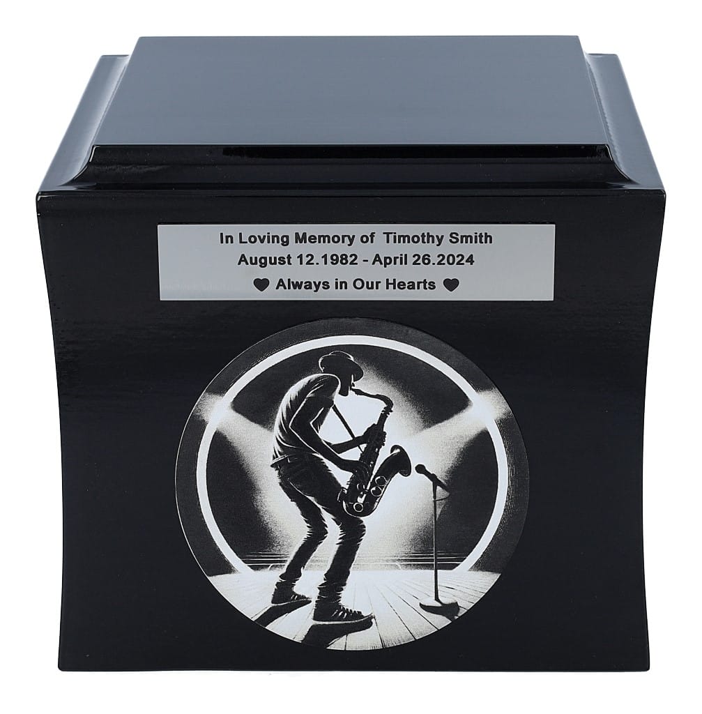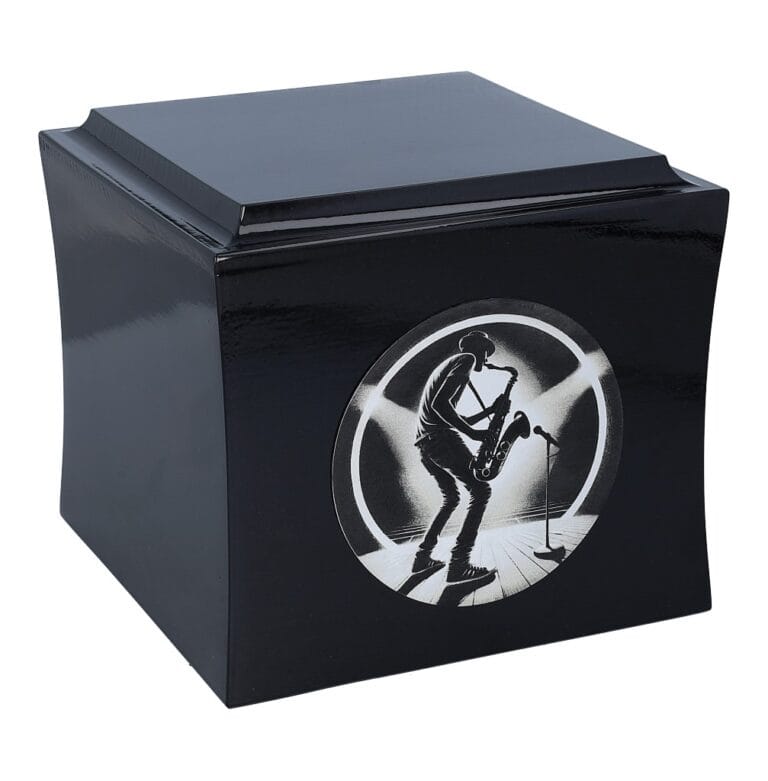 Urna ma klasyczny, pudełkowy kształt z delikatnie zaokrąglonymi krawędziami, dostępna w eleganckiej czerni lub bieli. Na jej froncie znajduje się precyzyjnie wygrawerowany saksofonista, symbolizujący miłość do muzyki i rytmu, który wciąż rozbrzmiewa w sercach bliskich.