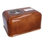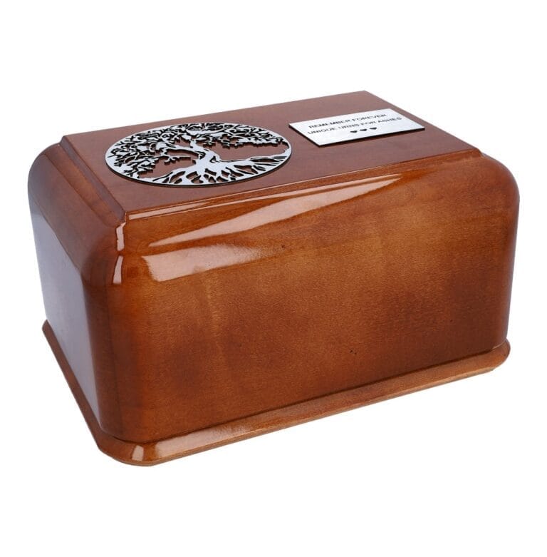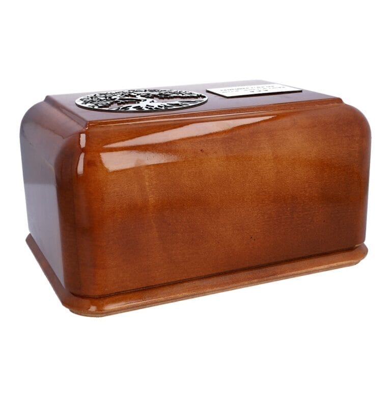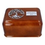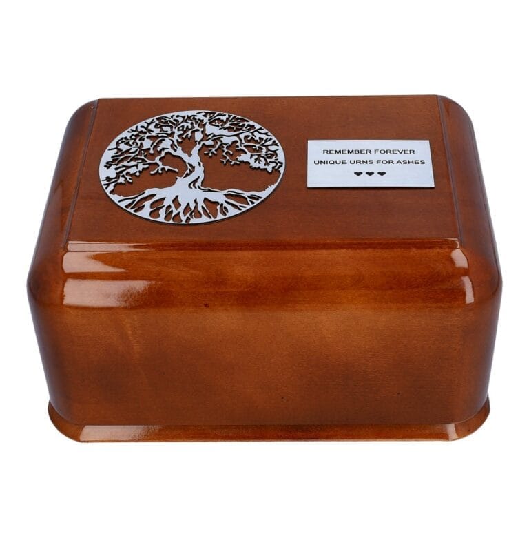 Ta piękna naturalna urna kremacyjna z pewnością zachwyci tych, którzy poszukują klasycznego stylu i naturalnego piękna. Wykonana z naturalnego drewna, ta urna jest ozdobiona pięknym drzewem życia z wykończeniem w kolorze srebrnym, które dodaje mu elegancji i wyrafinowania. Dzięki możliwości dodania grawerowanej plakietki z własnym tekstem, urna ta może stać się spersonalizowaną pamiątką, która przypomina o ukochanej osobie przez wiele lat.
