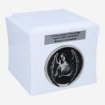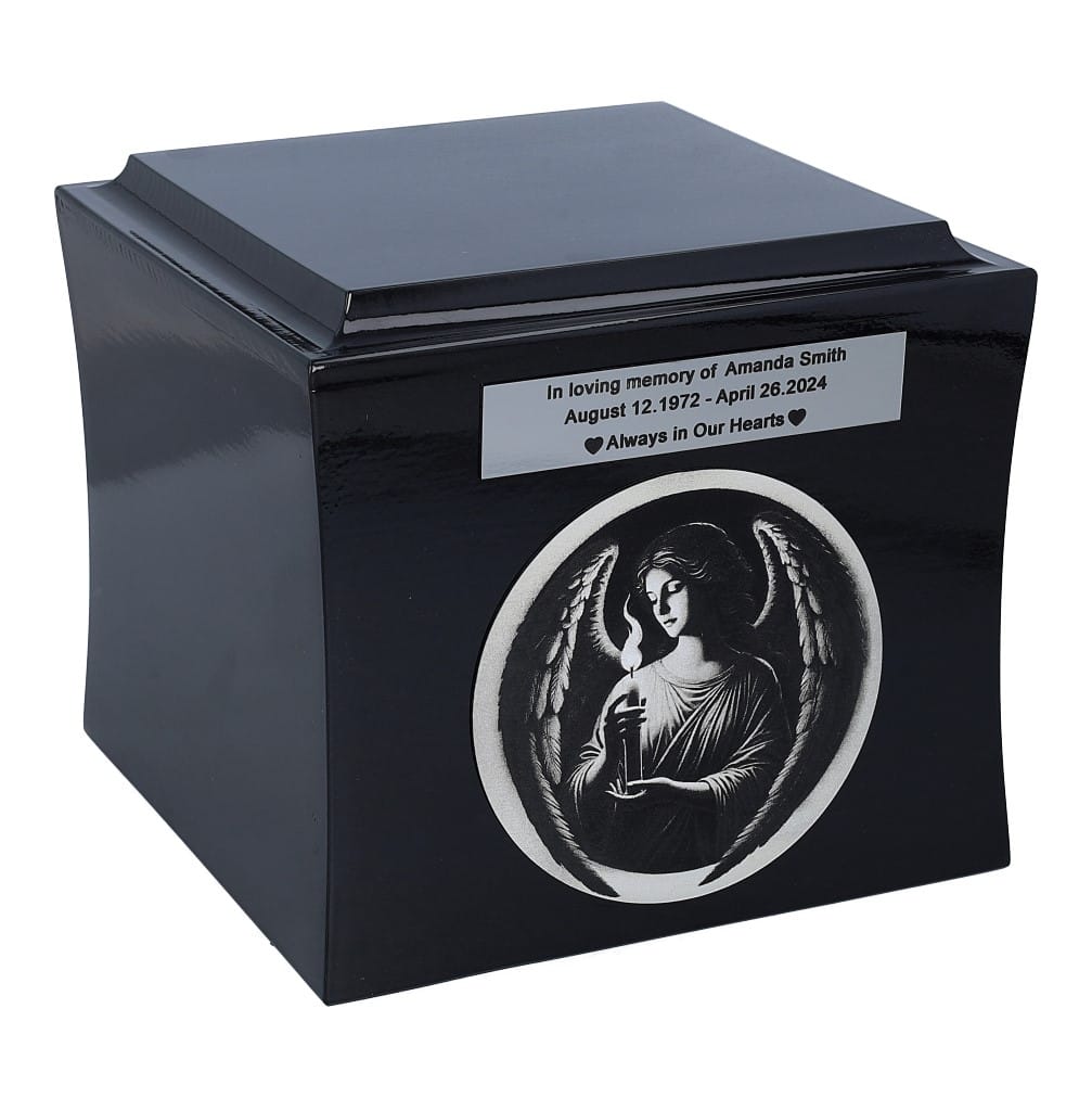 Urna ma klasyczny kształt pudełka i dostępna jest w eleganckim czarnym lub białym kolorze, dzięki czemu pasuje zarówno do nowoczesnych, jak i tradycyjnych przestrzeni pamięci. Jej lekko zaokrąglone krawędzie nadają jej delikatny i harmonijny wygląd. Na froncie znajduje się grawerowany anioł ze świecą – symbol ochrony, światła i wiecznego spokoju.