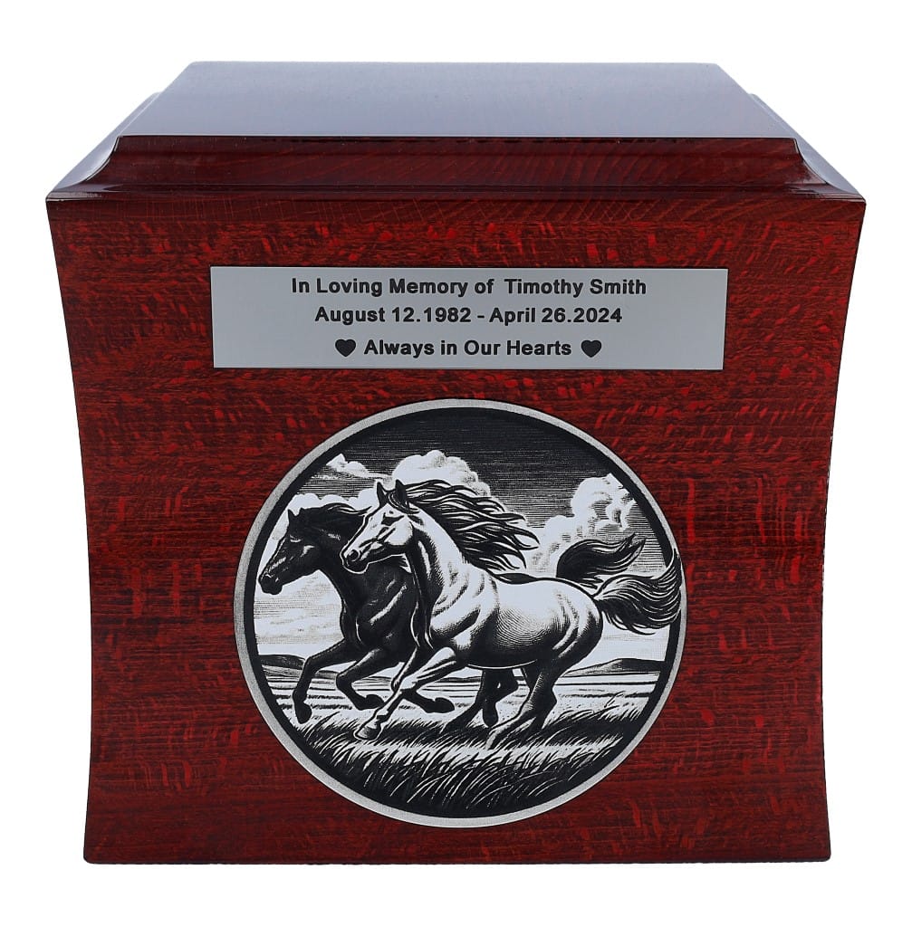 Urna posiada misternie wygrawerowany wizerunek koni na przedniej części, oddając piękno i ducha tych majestatycznych zwierząt. Lekko zaokrąglone krawędzie pudełka dodają nowoczesnej elegancji. Dodatkowo, spersonalizowana tabliczka pamiątkowa pozwala na dodanie własnego tekstu, takiego jak imię, ważne daty lub osobista wiadomość, czyniąc tę urnę wyjątkowym i wzruszającym hołdem.