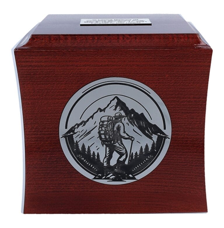 Prezentowana urna na prochy może być udekorowana grawerowaną ozdobą o tematyce gór oraz plakietką z własnym tekstem.