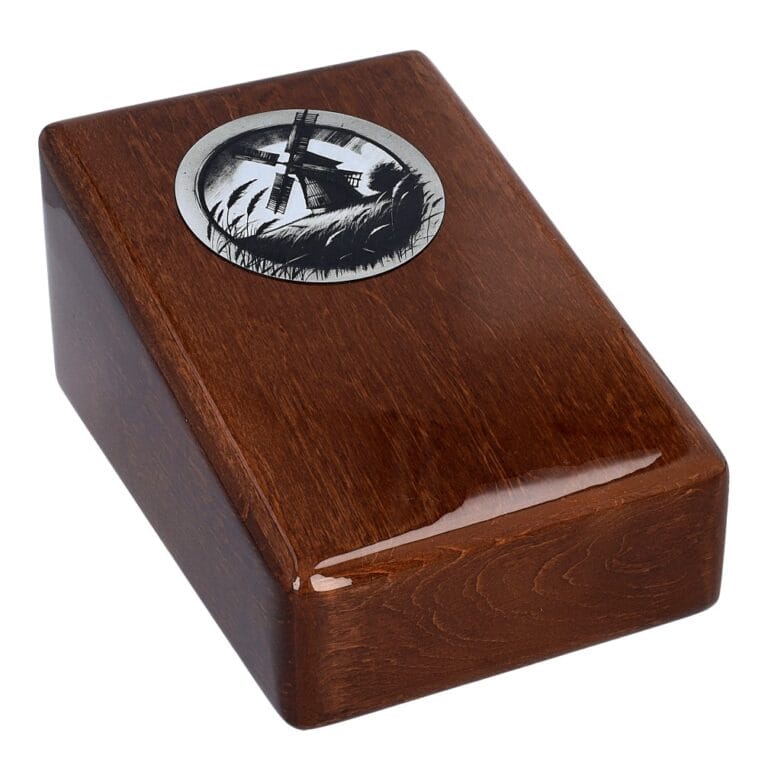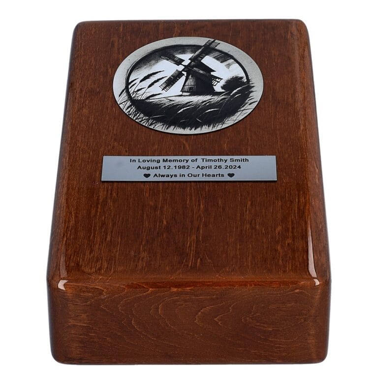 Życie, podobnie jak wiatr poruszający skrzydła wiatraka, jest pełne ruchu, zmian i nieuchronnego przemijania. Drewniana urna z motywem wiatraka to wyjątkowy sposób na uczczenie pamięci bliskiej osoby, która kochała wiejski spokój, naturę i harmonię otaczającego świata.