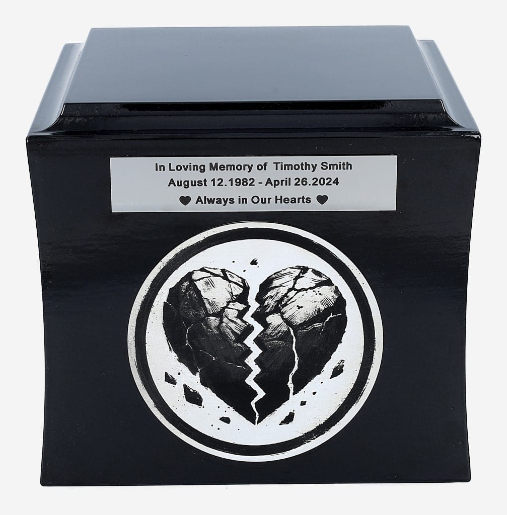 Uczcij pamięć bliskiej osoby dzięki urnie kremacyjnej z motywem złamanego serca, będącej symbolem miłości, straty i wiecznej pamięci. Wykonana z wysokiej jakości litego drewna, urna o kształcie pudełka z delikatnie zaokrąglonymi krawędziami łączy nowoczesny styl z głębokim przekazem emocjonalnym. Wygrawerowany wzór złamanego serca odzwierciedla ból po stracie, jednocześnie stanowiąc ponadczasowy znak niezniszczalnej więzi.