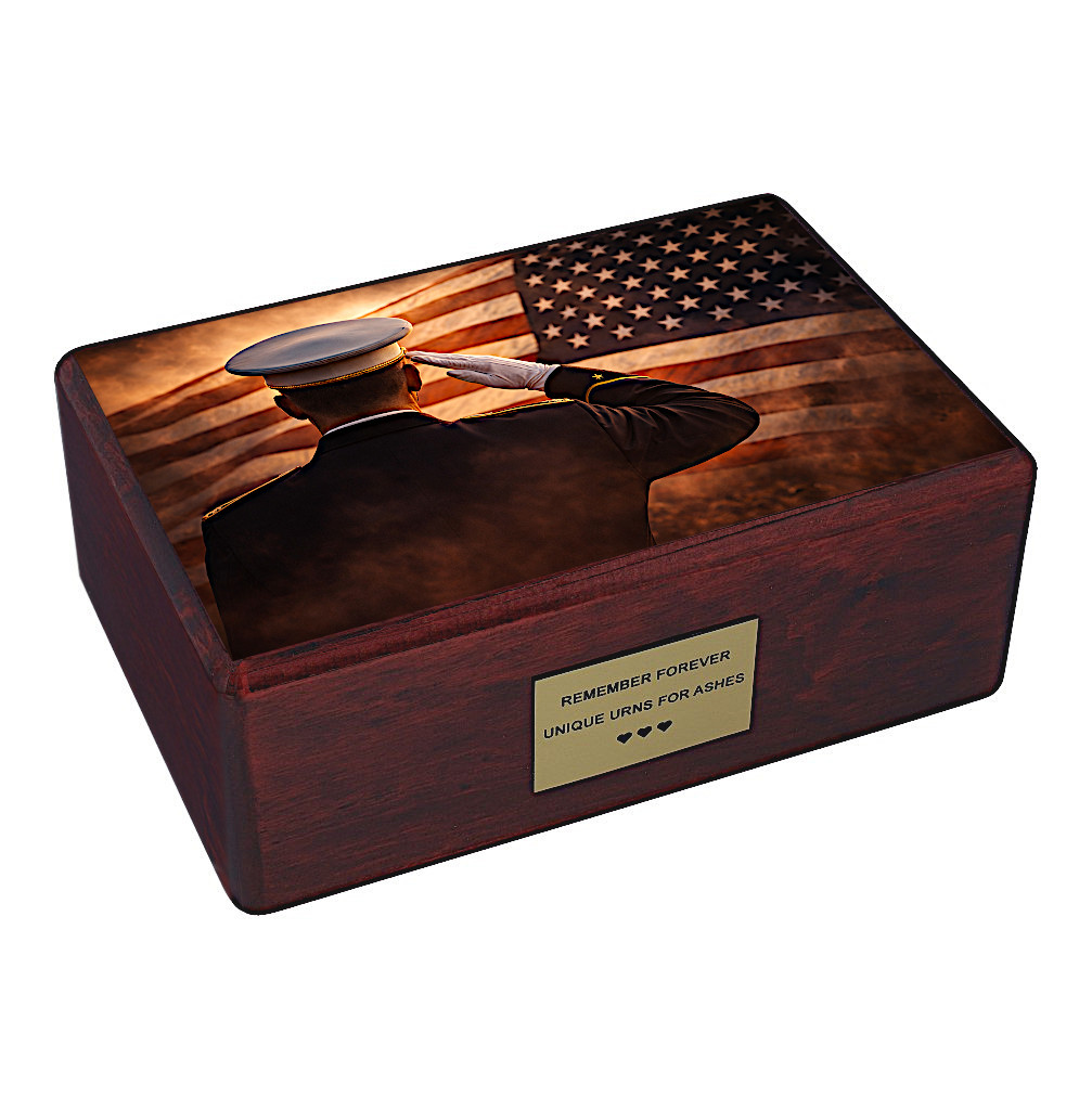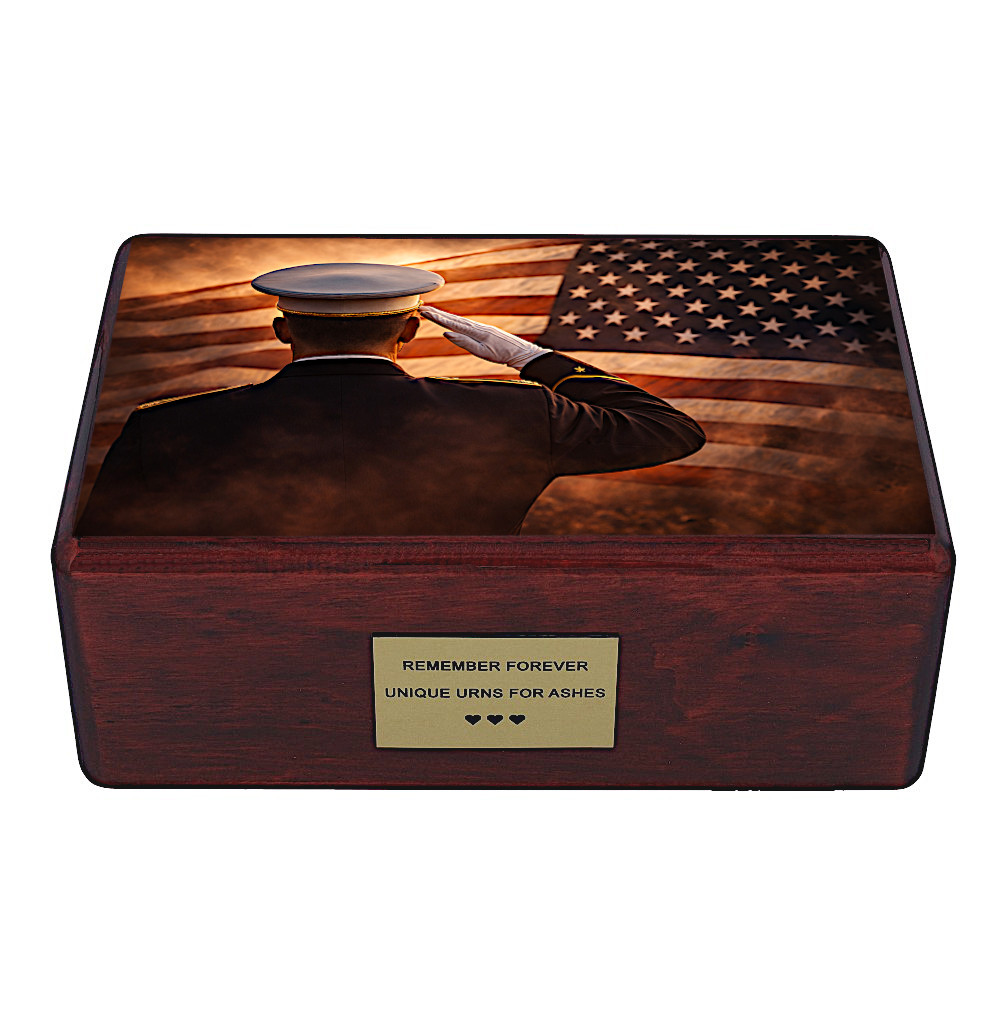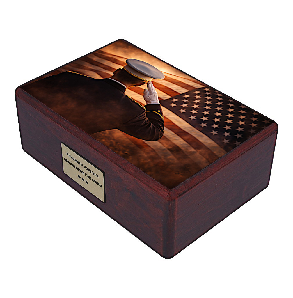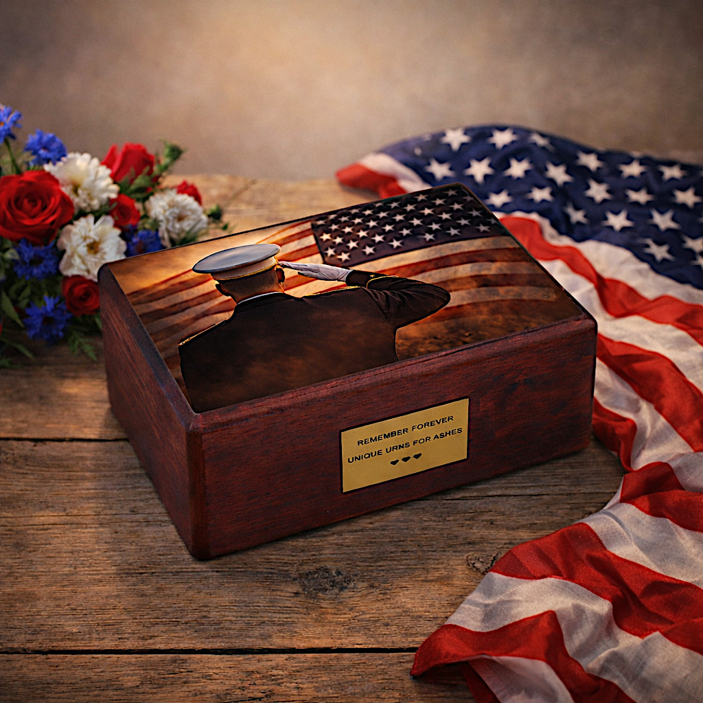 Pay tribute to a life of courage, honor, and service with a beautifully crafted American soldier urn for ashes. Created as a meaningful memorial for veterans and active-duty service members, the design features a striking image of a saluting soldier set against the American flag—symbolizing loyalty, sacrifice, and deep patriotism.