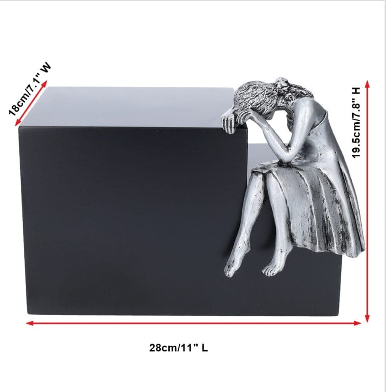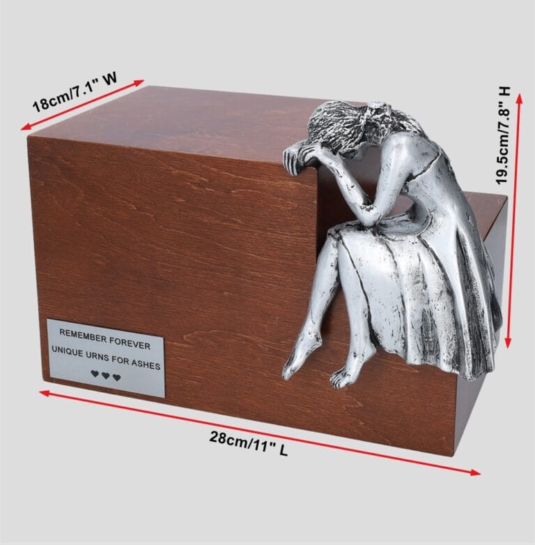 Introducing our exquisitely designed artistic cremation urn, a loving tribute to honor the memory of your beloved. Crafted with utmost care and attention to detail, this urn features a simple yet elegant box design, embellished with a breathtaking silver crying women figurine.