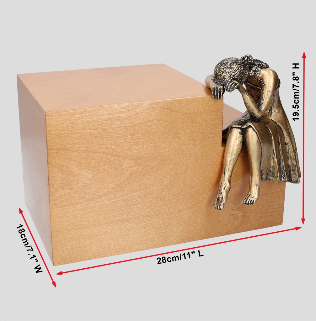 Crafted from the highest quality materials, this urn features a plain box design that exudes simplicity and elegance. The real beauty of this urn, however, lies in the stunning silver crying women figurine that adorns its top. The figurine is intricately crafted with exquisite attention to detail, and symbolizes the eternal mourning of the loved ones left behind.