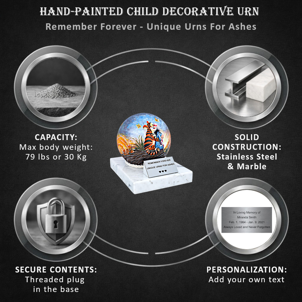 Crafted from high-quality stainless steel, this urn is built to last, ensuring long-term preservation of your child’s memory. The smooth, polished surface is hand-painted with delicate depictions of a playful little tiger and a gentle donkey, inspired by the beloved characters from Winnie the Pooh. These familiar and comforting figures evoke innocence, friendship, and warmth, making this urn a meaningful tribute.