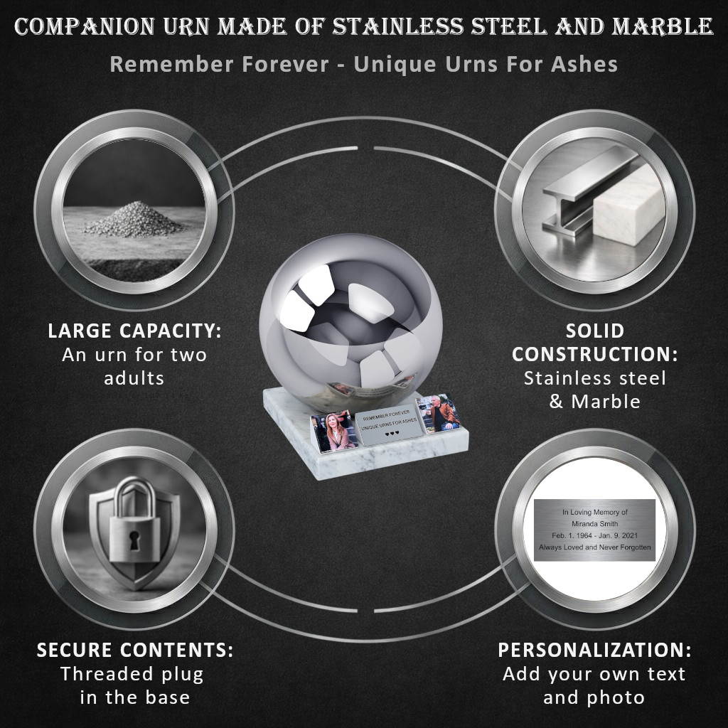 Companion Cremation Urn for Two – Stainless Steel Sphere with Marble Base & Two Photos
