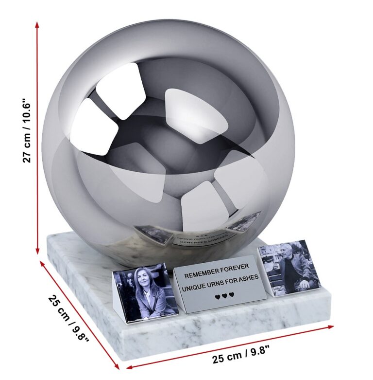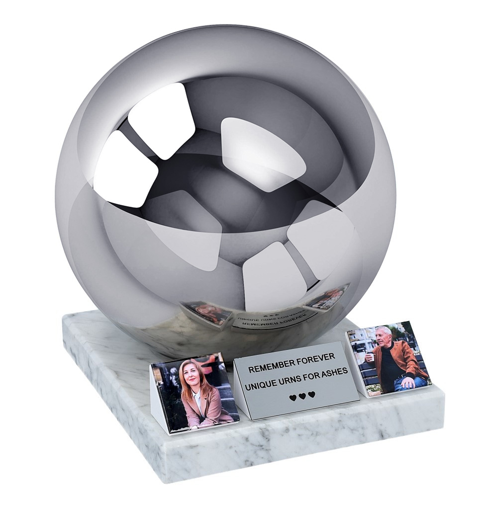 Crafted from premium mirror-polished stainless steel, the urn features a timeless spherical form that reflects light beautifully. It rests on a solid marble base, adding weight, stability, and elegant contrast.
