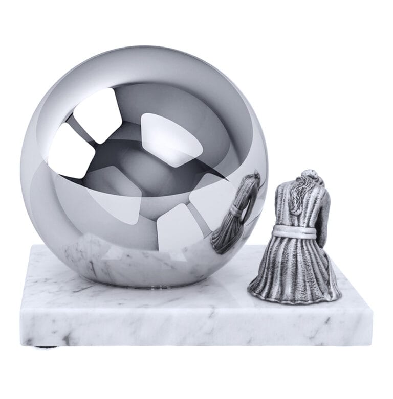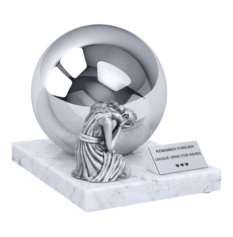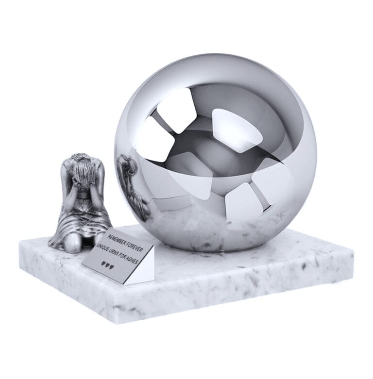 The “Grief” urn is a unique and deeply symbolic cremation piece for those seeking an artistic expression of sorrow and remembrance. Crafted as a polished stainless-steel sphere mounted on a sturdy marble base, it combines elegance with stability. The sphere’s reflective surface mirrors its surroundings, creating an effect of infinite depth, symbolizing the timeless bond and enduring memory of a loved one.