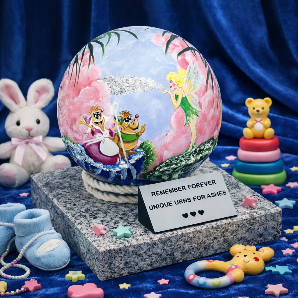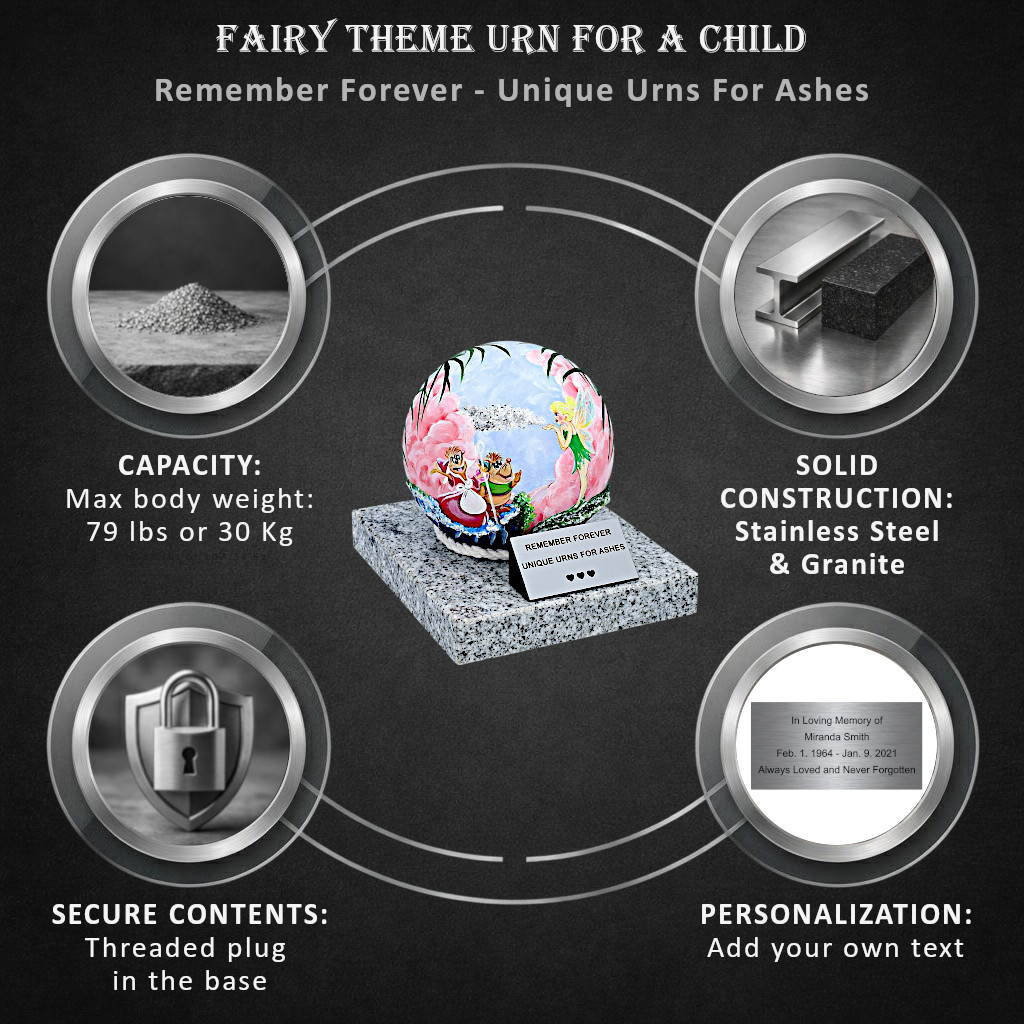 The urn features a hand-painted stainless steel sphere, adorned with a magical fairy motif, symbolizing innocence, wonder, and eternal light. Resting on a solid stone base, it combines elegance with lasting durability. The base also includes a customizable memorial plaque, where a name, dates, or a heartfelt message can be engraved, making this urn a truly personal keepsake.