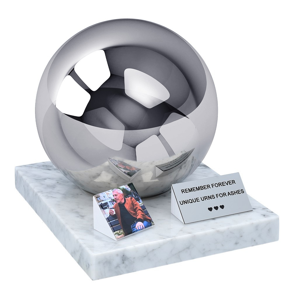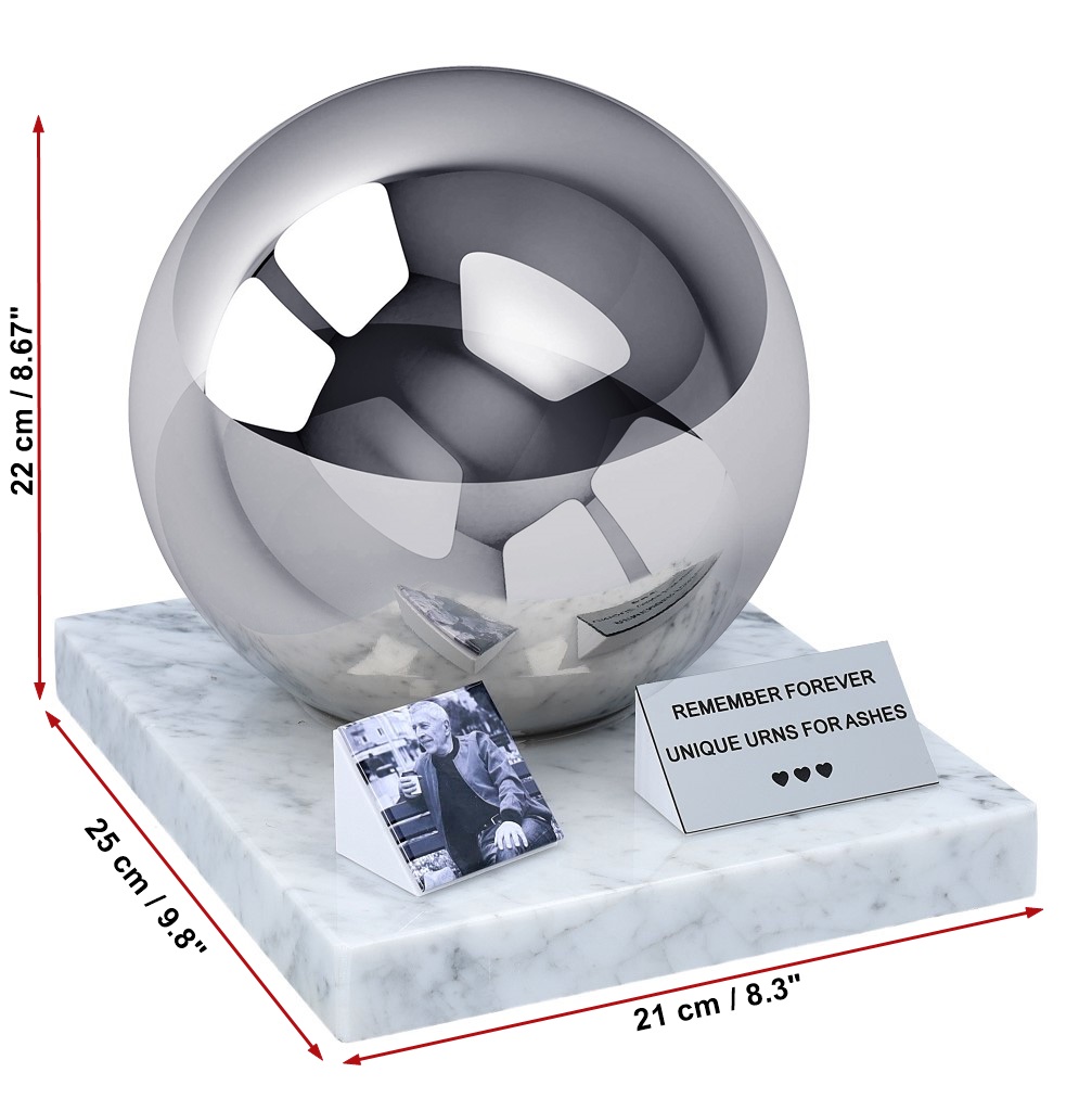 Preserve the memory of a loved one with this modern, elegant adult cremation urn, crafted from high-quality polished stainless steel and placed on a solid marble base. Its timeless spherical form and mirror finish create a calm, refined memorial that fits beautifully into any home, remembrance space, or memorial shelf.