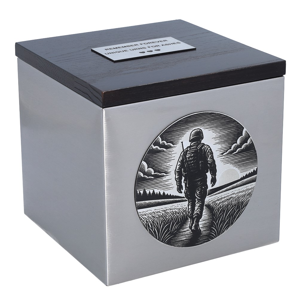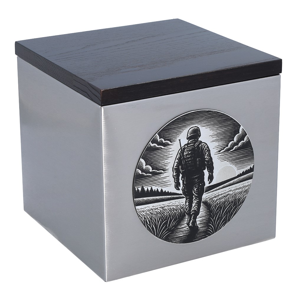 A memorial urn with a soldier motif is a unique tribute to a person who served with pride and devotion. This touching design depicts the silhouette of a soldier walking towards the setting sun, symbolising eternal peace and well-deserved rest.