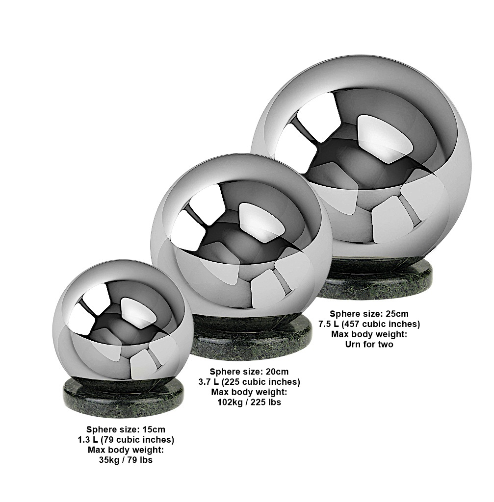 The urns feature a round stone base that is both sturdy and durable, providing a stable foundation for the stainless steel sphere. This combination of materials not only ensures longevity but also enhances the natural beauty of your outdoor environment. The elegant simplicity of the stainless steel sphere, paired with the timeless appeal of the stone base, creates a peaceful and lasting tribute to your loved one.