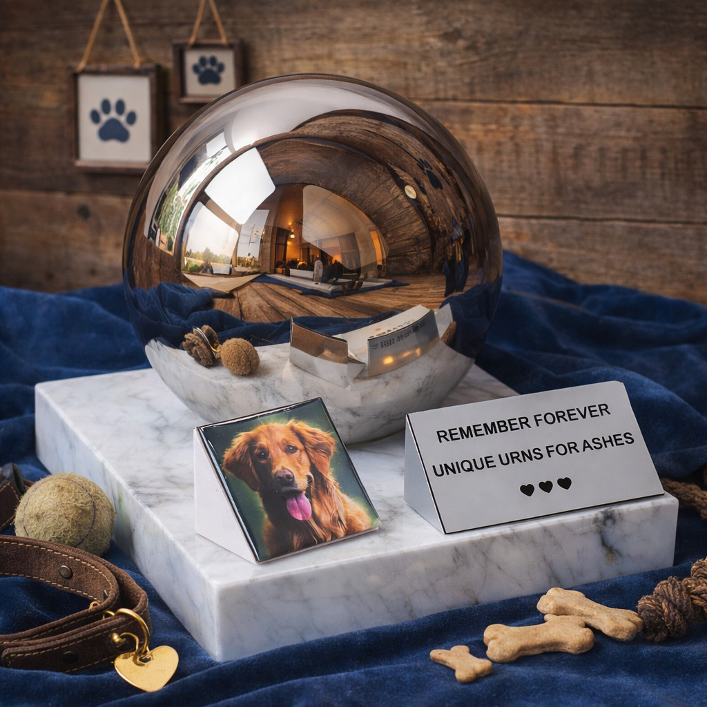 Honor the memory of your beloved pet with this unique, modern cremation urn, designed for dogs, cats, and other cherished animals. Crafted from high-quality mirror-polished stainless steel, the urn features a timeless spherical form that reflects light beautifully and brings a calm, elegant presence to any memorial space.