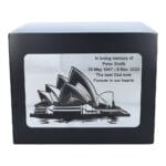 This Black Wooden Cremation Urn, adorned with the Sydney Opera House, seamlessly blends aesthetics with functionality, providing a fitting and sophisticated tribute to celebrate the life of your loved one. Honor their memory with a piece that encapsulates the beauty of a global landmark and the warmth of a personalized message.