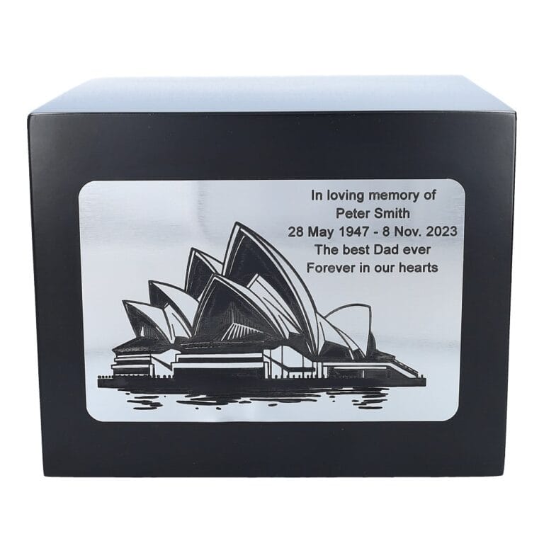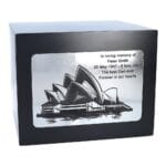 Embrace a timeless tribute to your loved one with our Black Wooden Cremation Urn, adorned with a captivating engraved plaque featuring the iconic Sydney Opera House. This elegant urn provides a dignified final resting place for cremated remains.
