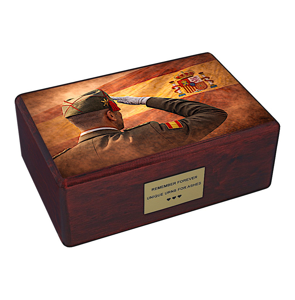 Celebrate the life, honor, and dedication of a loved one with a beautifully designed Spanish soldier urn for ashes. Created as a meaningful tribute for military personnel, the artwork features a saluting soldier set against the Spanish flag—symbolizing loyalty, courage, and national pride.
