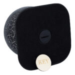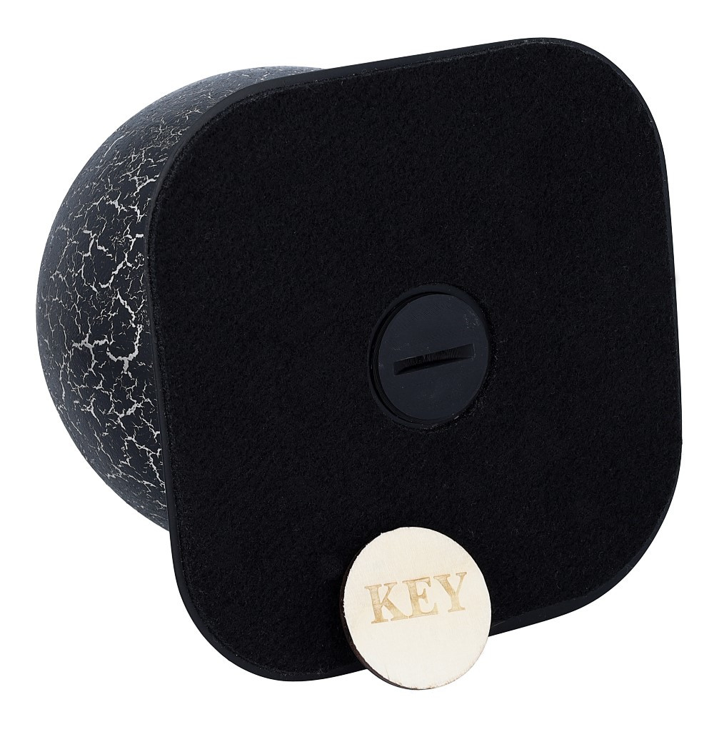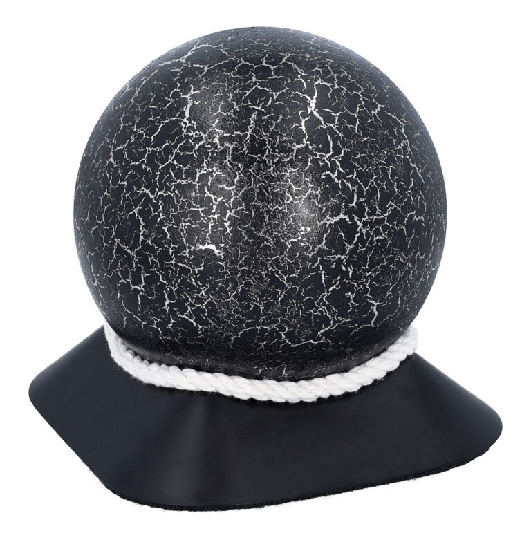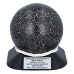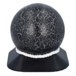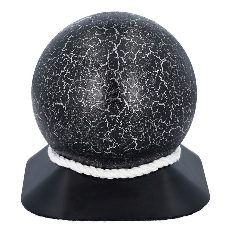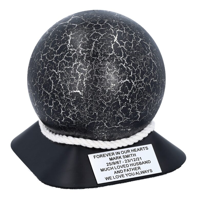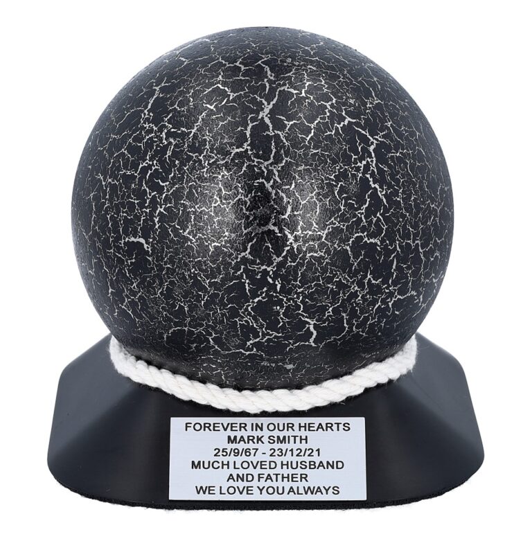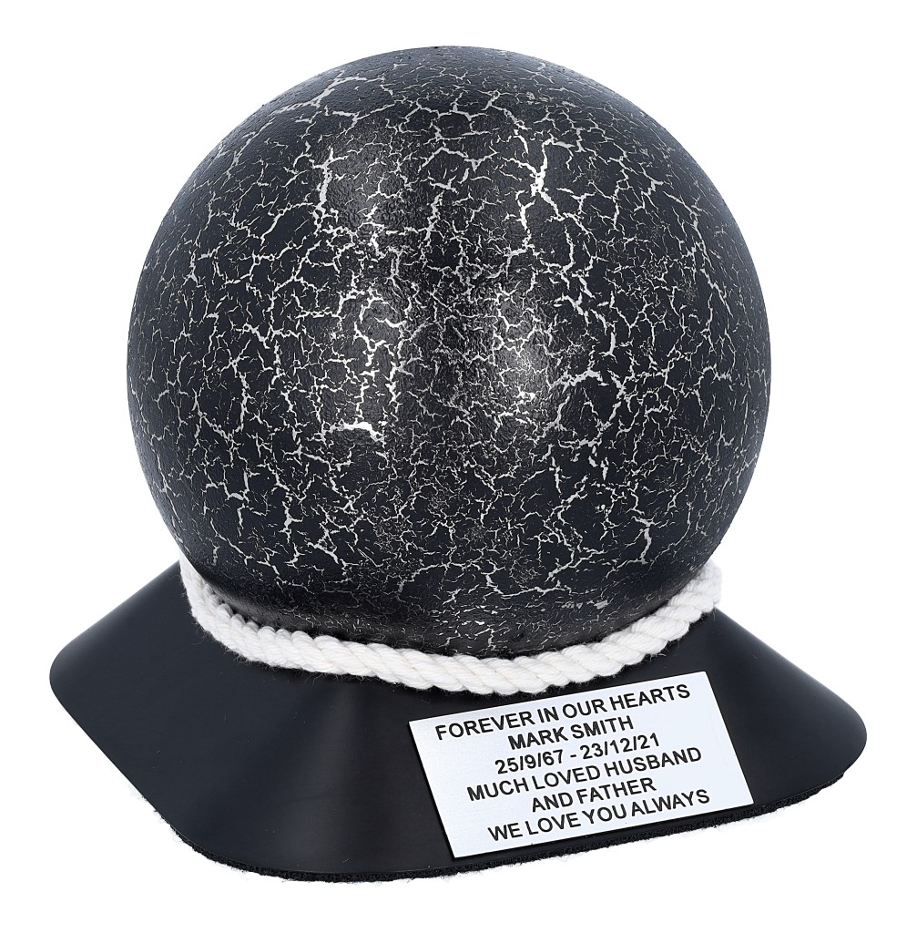 A modern and symbolic cremation urn with a unique spherical shape. Made from high quality stainless steel, covered with a decorative coating achieved by decoupage in a black and silver crackled finish. The urn is set on an elegant base in durable ABS plastic, decorated with cotton cord and a personalisable plaque.