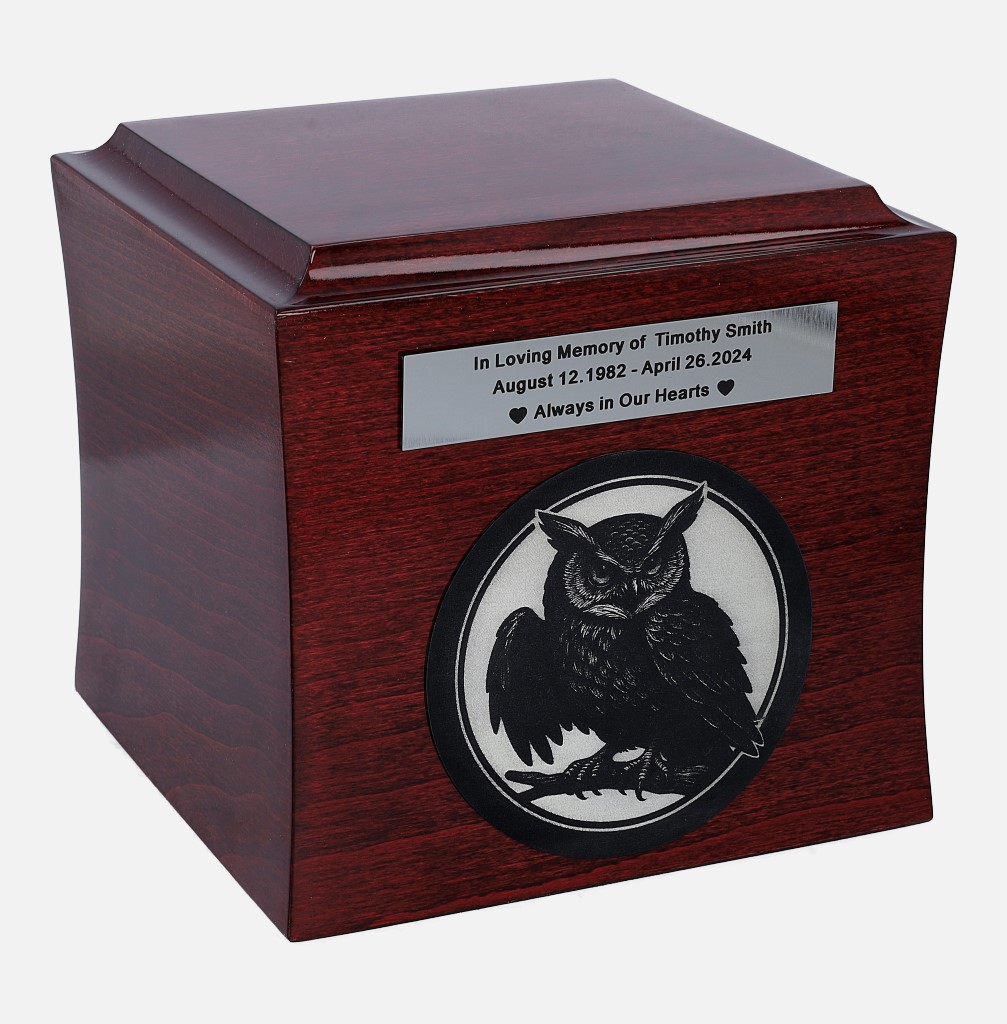 The themed funeral urn with engraved owl is a unique symbol of remembrance and wisdom, created for those who value peace, reflection and closeness to nature. The urn is made of high quality wood with an elegant mahogany finish that emphasises its timeless character.