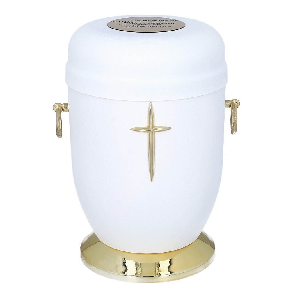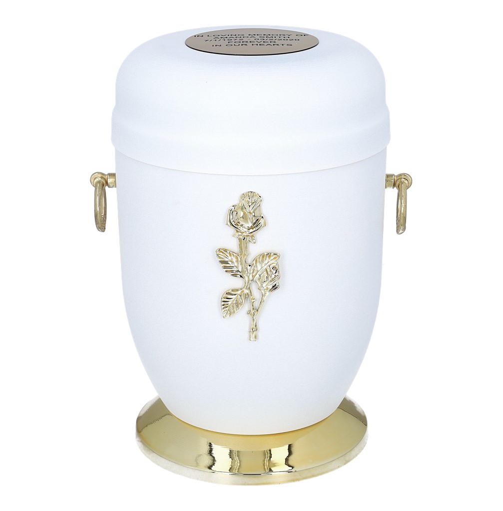 The front of the urn features an engraved rose or cross – you can choose whichever motif best suits your loved one’s personality and faith. The top of the urn is finished with an elegant gold detail that adds a unique touch.