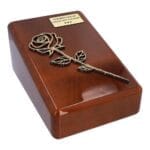 Wooden urn with rose and memorial plaque
