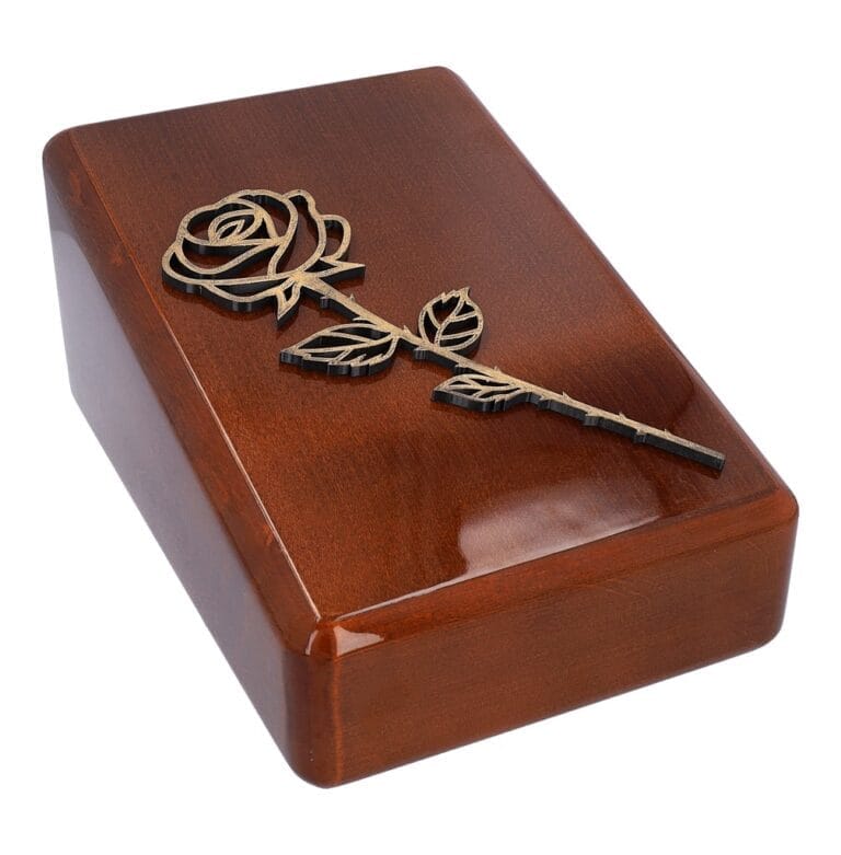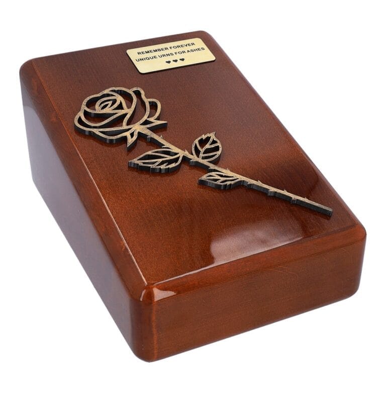 Introducing our elegant wooden urn adorned with a delicate rose motif and personalized memorial plaque. Crafted with care, this urn offers a timeless tribute to your loved one.